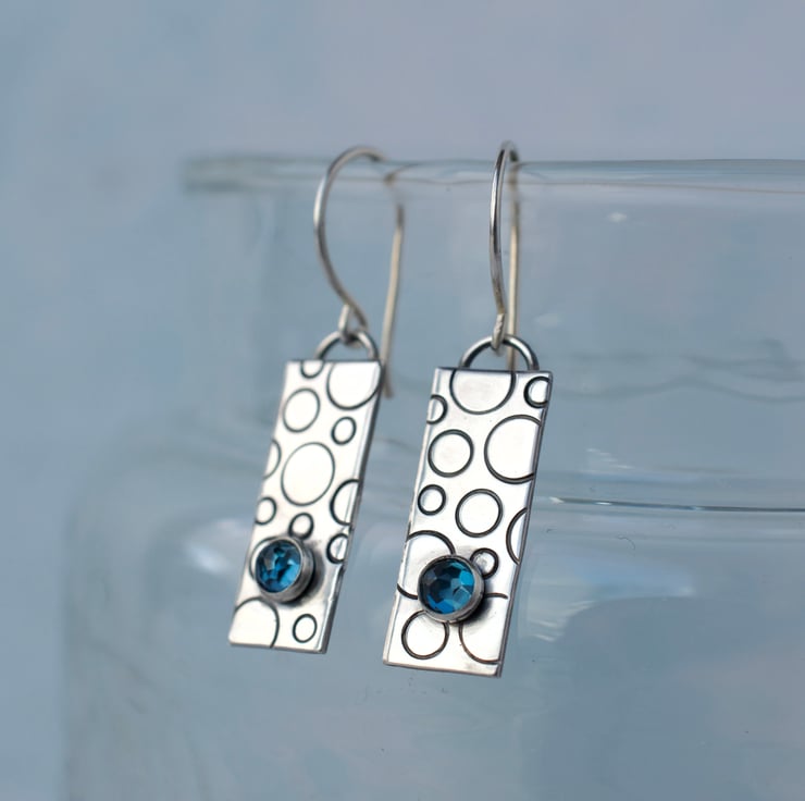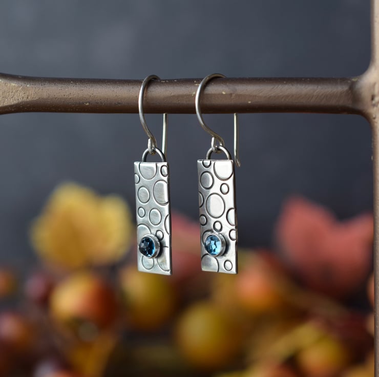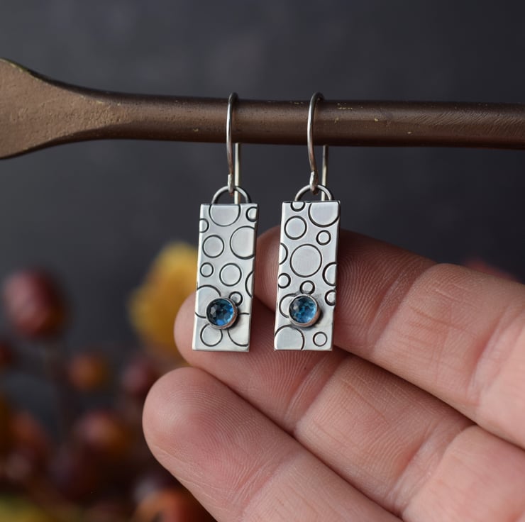Designed and crafted by Isobel Robinson, these elegant rectangular earrings feature a hand textured ‘bubble’ design which is unique to each piece. Faceted stones of London blue topaz add a flash of colour to the piece, before oxidising to add depth of colour and polishing back to a shine. The design is suspended from handmade ear wires for a true artisan finish.