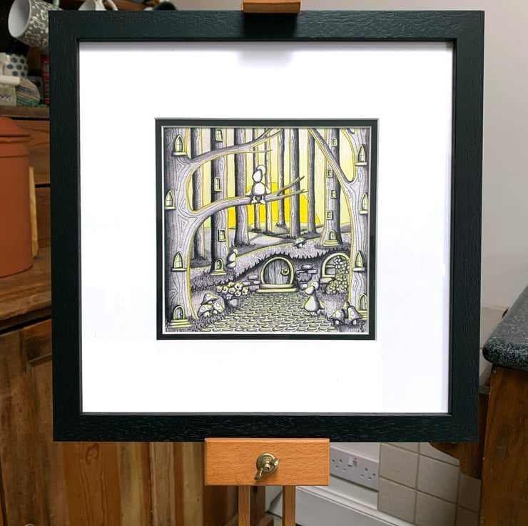 A New Dawn is a pen and ink illustration of a mythical forest scene with ducks and mini houses as the sun rises in the background.