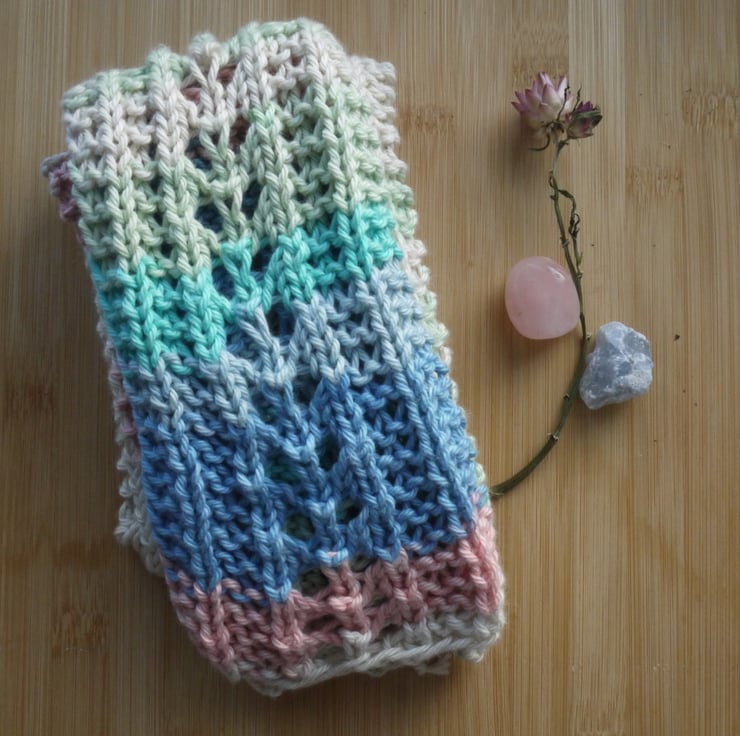 Loom knitted summer scarf in 100% cotton making it light and breathable to wear during spring/summer. This scarf features ivory, cornflower blue, dusky pink, soft green and aqua tones that are gradient throughout the delicate pattern.