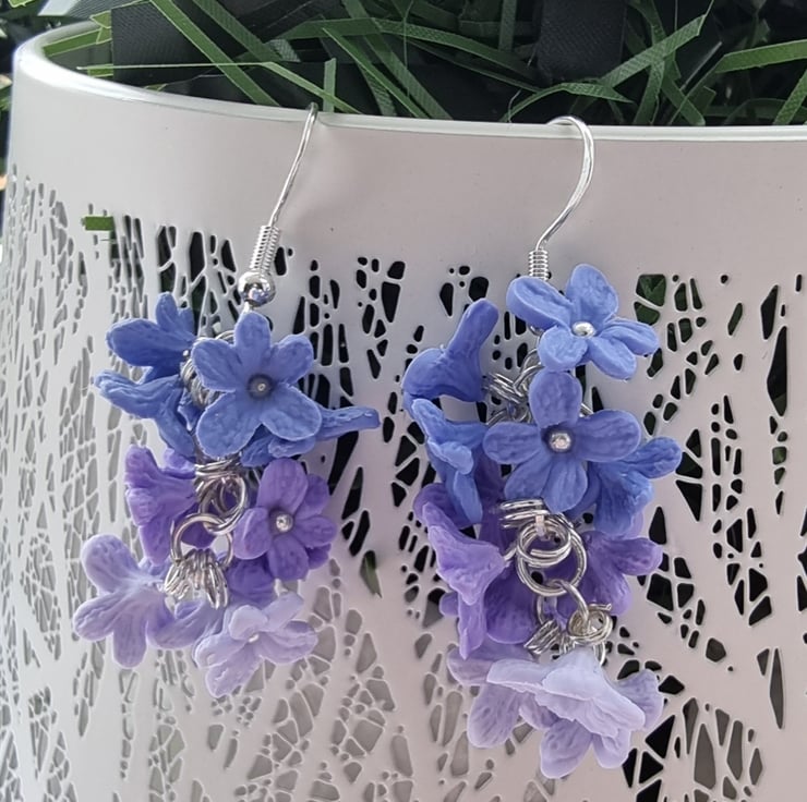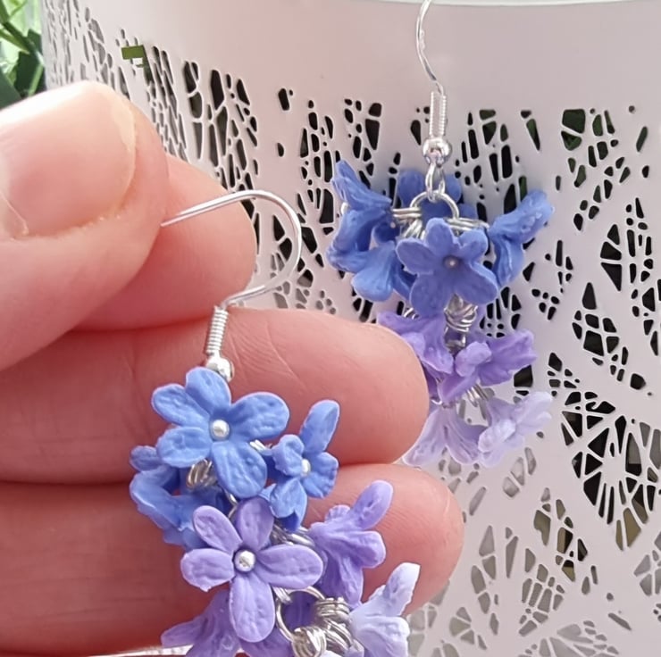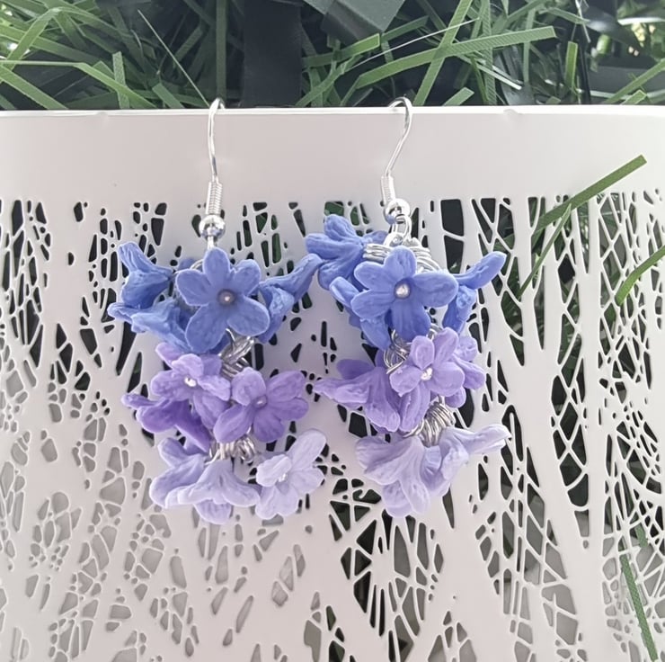 Bbeautiful cluster of gradient lavender blossom. Each crafted from polymer clay and hung on silver plated hooks.