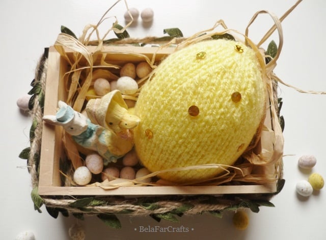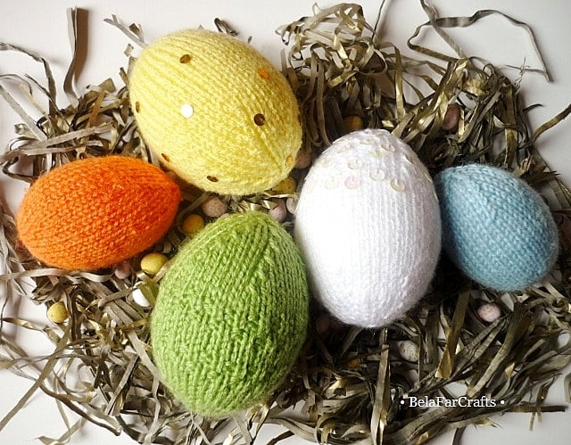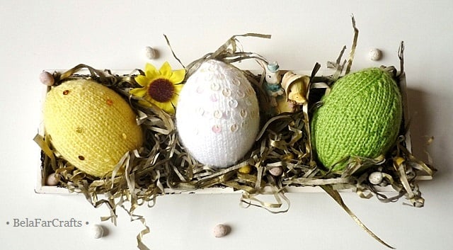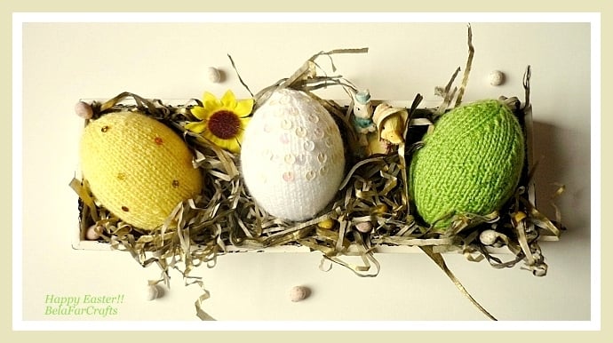 The 3 large eggs measure 9cm (3.5in) tall and 21cm (8in) in circumference. The covers are fitted around polystyrene eggs and are hand knitted in acrylic yarns, available in a wide range of colours. I added sequins for some sparkle!