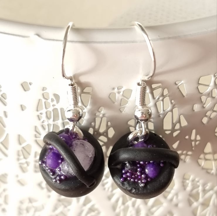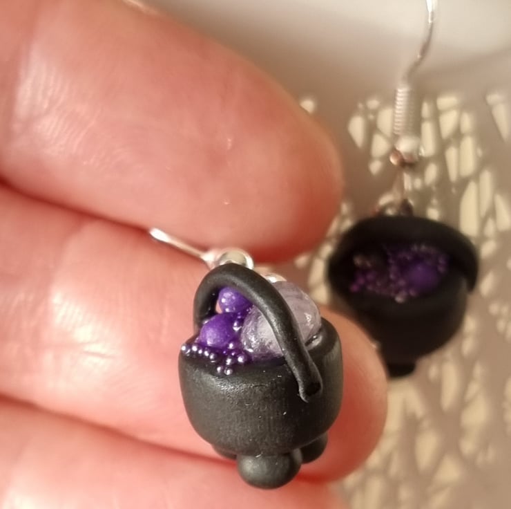 Tiny bubbling cauldron earrings, individually made from polymer clay, filled with frothy micro glass beads, clay bubbles and a gemstone chip. Hung on silver plated hooks.