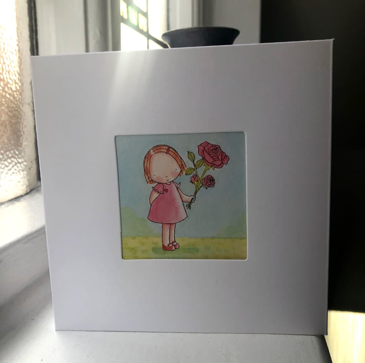 Mother's Day Card or Birthday card with Cute girl holding a Rose flower.