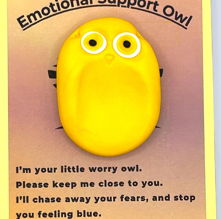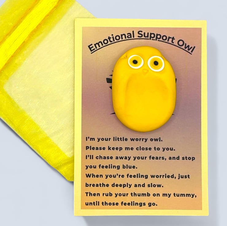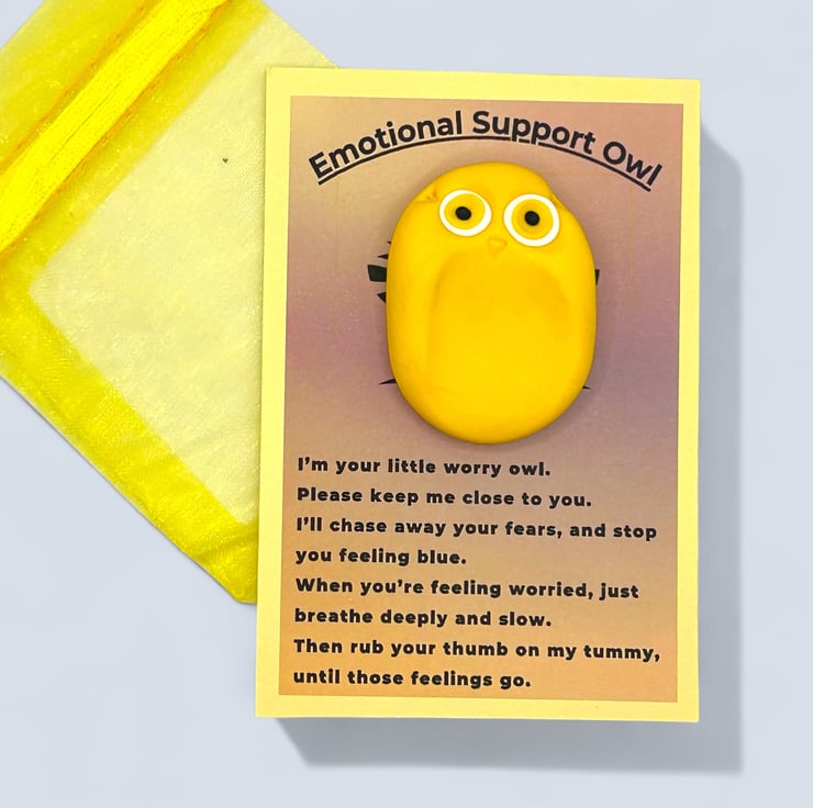 This adorable little yellow owl is handcrafted from polymer clay using my unique design. It makes a lovely, thoughtful gift for anyone who could use a little comfort or as a self-care gift for yourself. It features a smooth indent on its tummy, allowing it to fit comfortably in your hand with your thumb resting in the indent. This owl can be a grounding tool when you’re anxious or overwhelmed. Focusing on the sensation of your thumb on its smooth tummy and taking deep breaths can help comfort you and bring you back to the present moment.