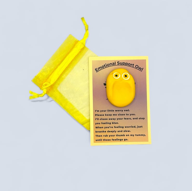 The owl comes attached to a card that includes a poem I wrote about its purpose. You can easily detach the owl from the card for convenience, making it easier to fit into your pocket or handbag. I’ve also included a small organza bag in a complementary colour for safely storing your owl buddy. Since each owl is handcrafted, no two will ever be alike, but they will all be undeniably cute.