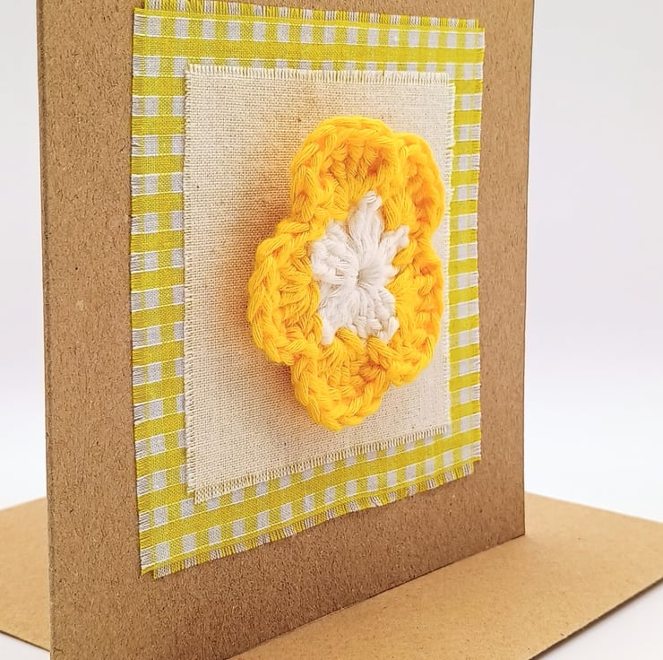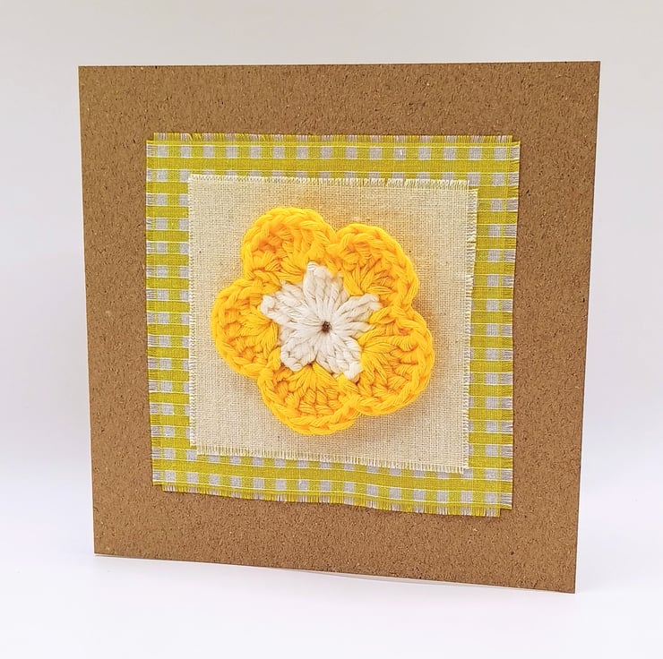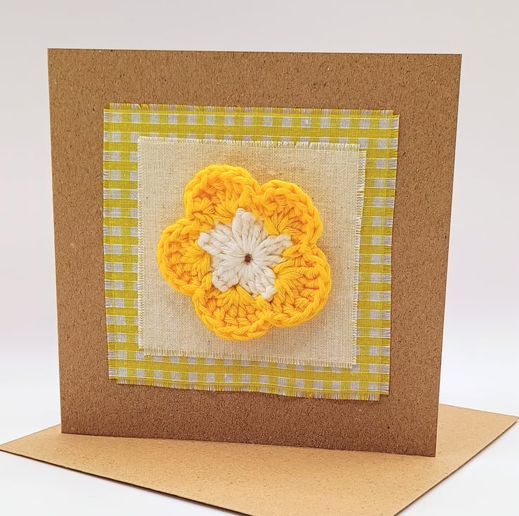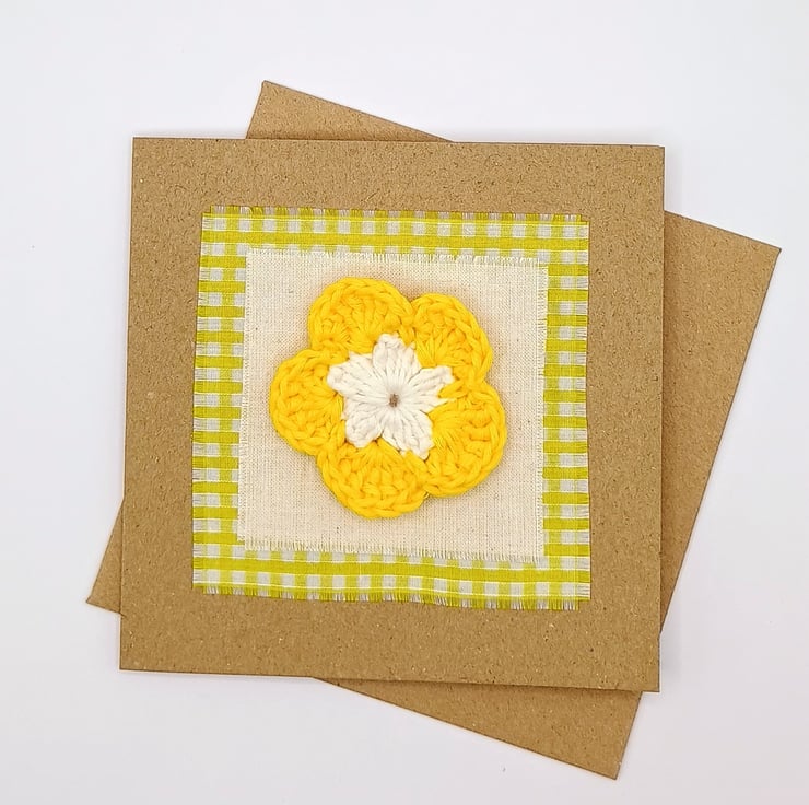 A bright, greetings card, featuring a yellow crocheted flower sitting on a calico and yellow gingham fabric background. An ideal birthday card, anniversary card, get well soon card or notelet. The card has been left blank for you to compose your own personal message whatever the occasion.