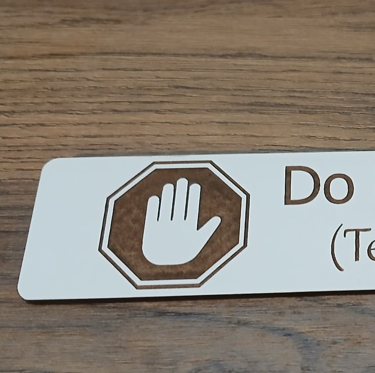 We use both our black and white top wood. As these woods really highlight the engravings and both are durable. Also we use strong but sensitive adhesive strips, which holds the sign well to the door but does not make any mess. Important in homes that are rented or as children get older and want different signs.