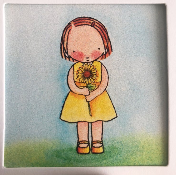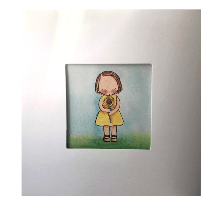 Sunflower Birthday card or can be a Mother's Day card featuring a cute girl holding a sunflower flower dressed in her yellow dress.