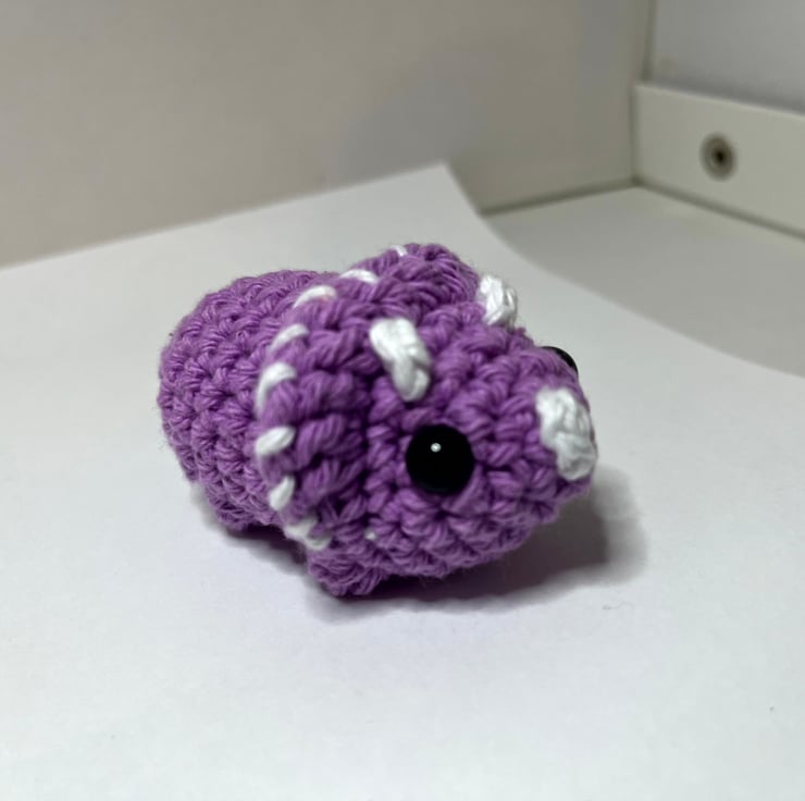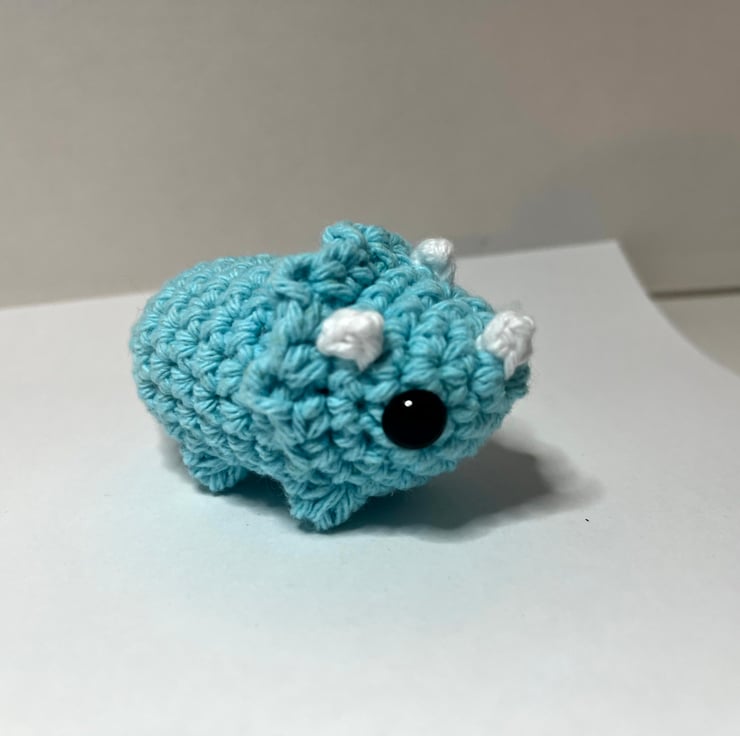 A range of small dinosaurs in bright colours made with 100% cotton yarn. - also available as a keyring. Choose your favourite dinosaur in mini form to take with you wherever you go! Will you choose the tiny t-rex or the mini triceratops? Why not collect them all! These are small enough to take everywhere and can brighten up your backpack or bag.