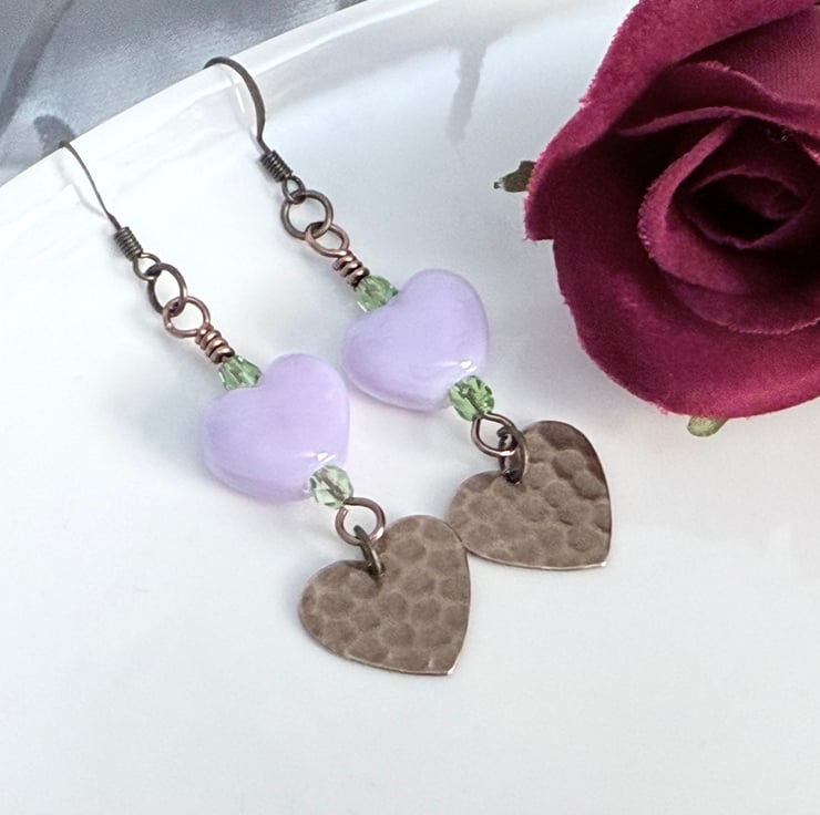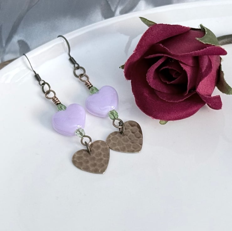 These colourful bohemian inspired earrings have been handmade with chunky lamp-work glass beads and Czech glass beads. The main focal of these earrings are the beautiful lamp-work hearts, these beads are an opaque bright lilac colour and have been matched with small peridot green fire polished Czech glass beads. The beads are threaded onto handmade wire connectors and hanging below these beads are brass hearts that have a hammered pattern on them.