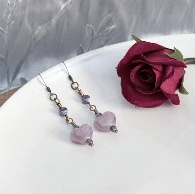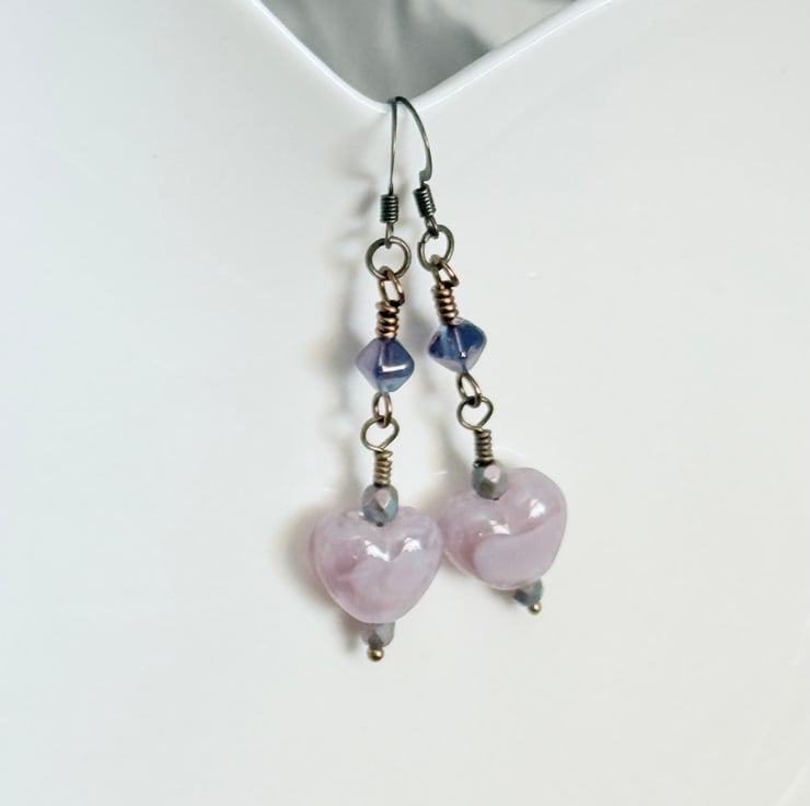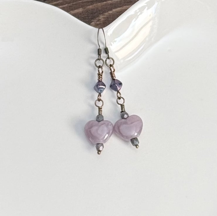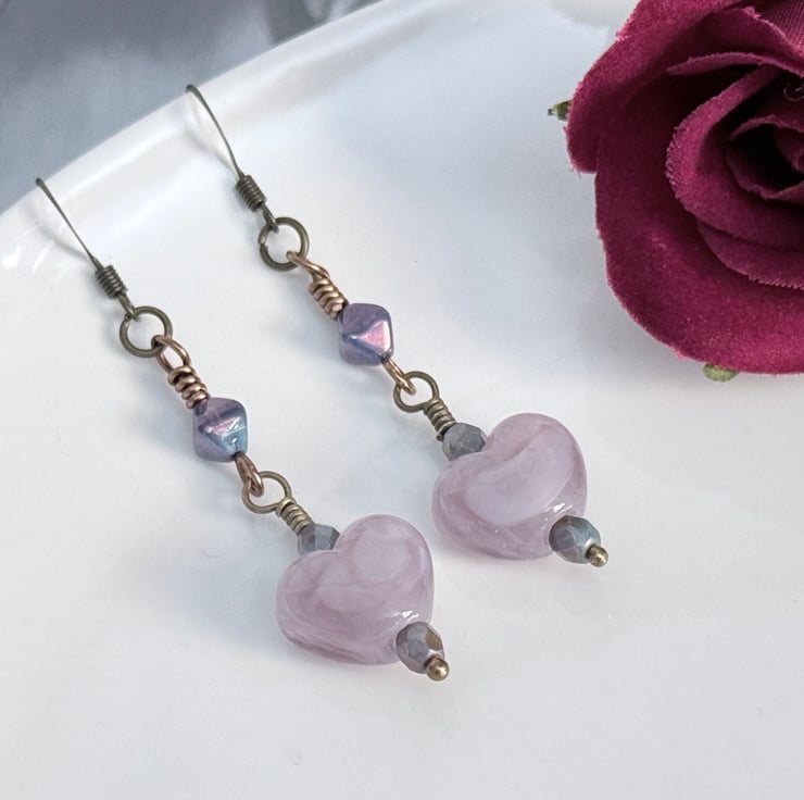 Handmade bead earrings made with a mix of lamp-work beads and Czech glass beads in lilac tones. The main focal of these earrings is the beautiful lamp-work hearts, this is a handmade bead and the lilac shades of the glass swirl together within it.