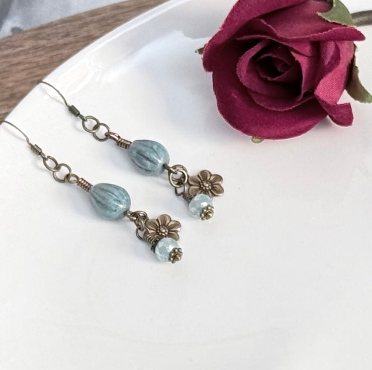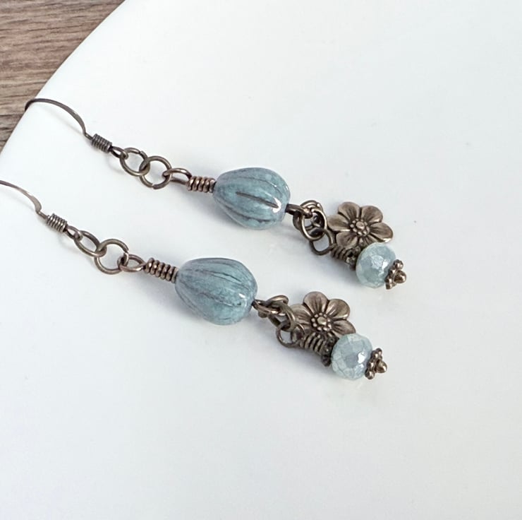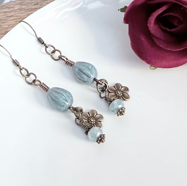 The teardrop beads have been threaded onto handmade wire connectors and hanging below is a small embossed brass daisy and a shimmering silver blue fire polished bead.