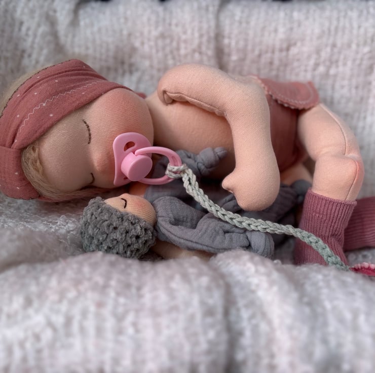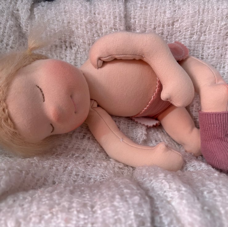 SHe has a cute belly button she comes dressed in a nappy ,socks ,pink muslin dress matching hair band hand crocheted cardigan dummy and clip and a mini Waldorf baby