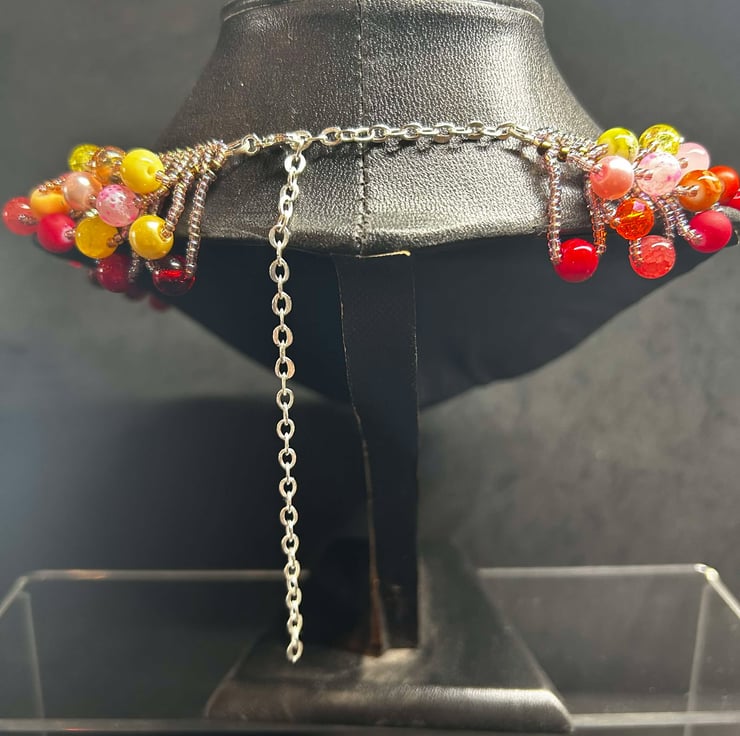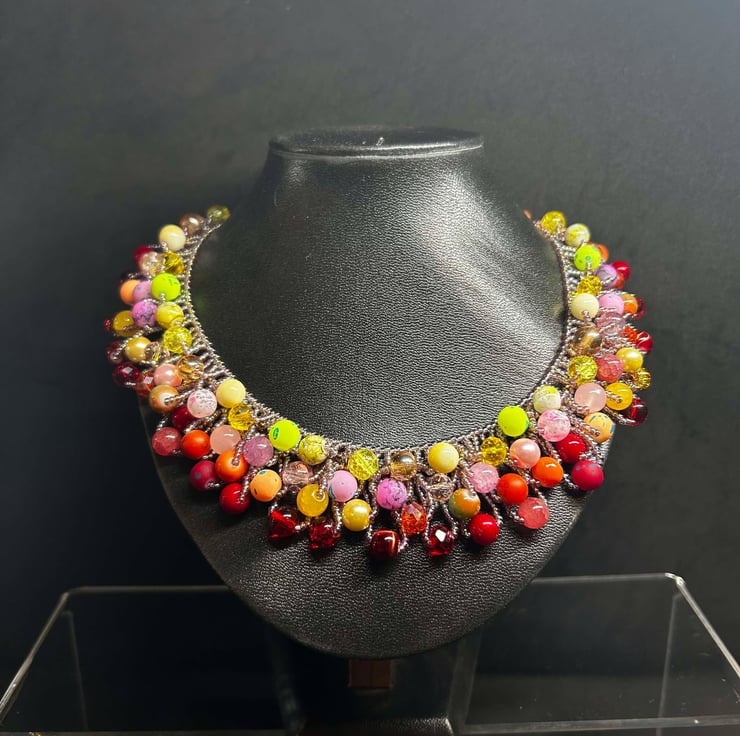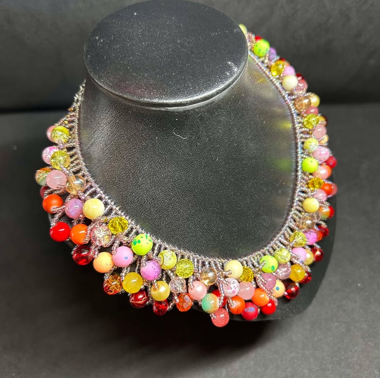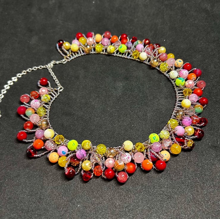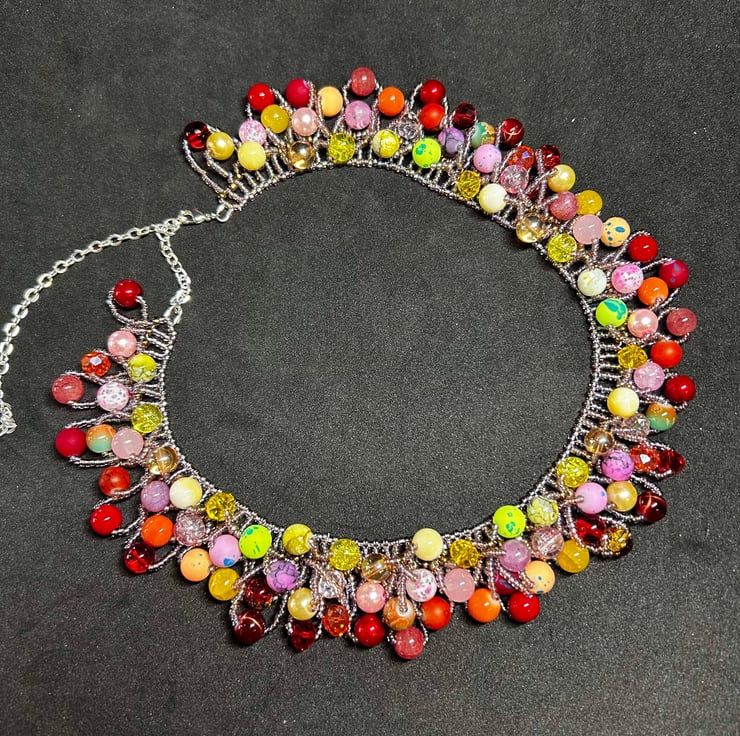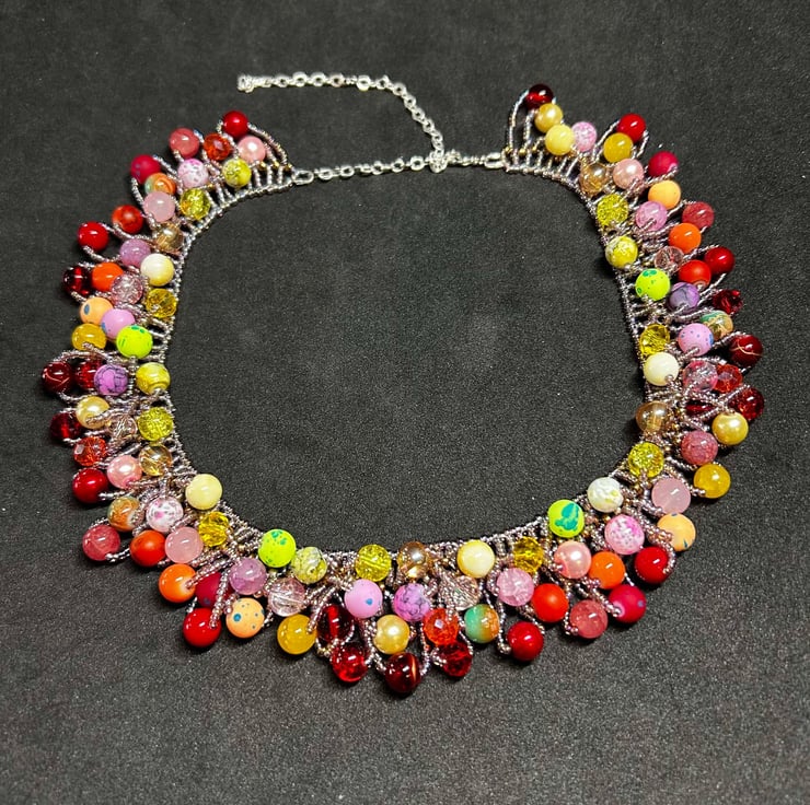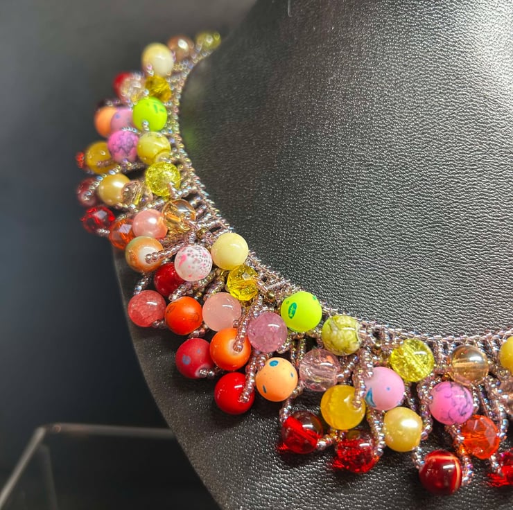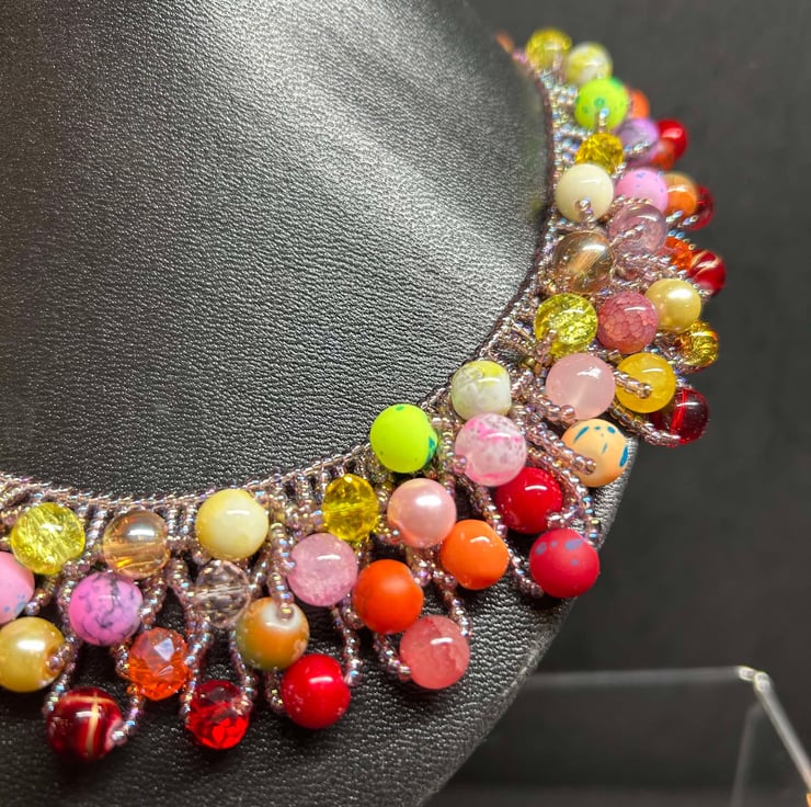 Layers of coloured and textured 8mm glass beads cascade around the neckline to create a fun, bubble-style necklace that is both complex and visually striking. The beads are divine, and I loved working with them to create this fun and fabulous piece.