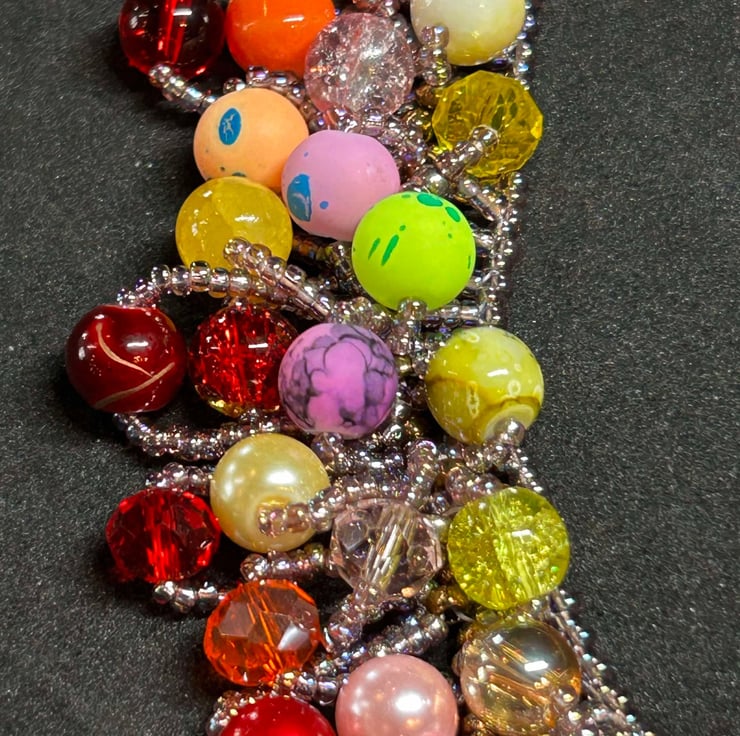 Jewellery Maker TV presented me with a range of fabulous glass beads and challenged me to make something different. Well, I do like a challenge, and the beads were so beautiful that I had to use as many as I could in this piece.
