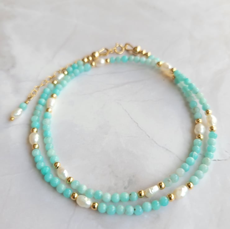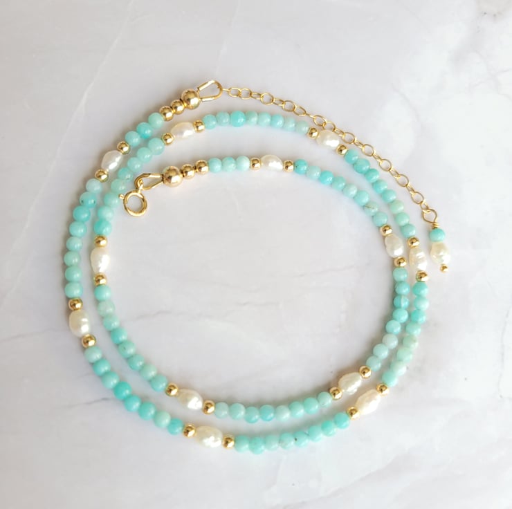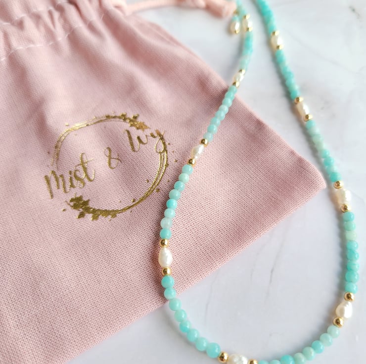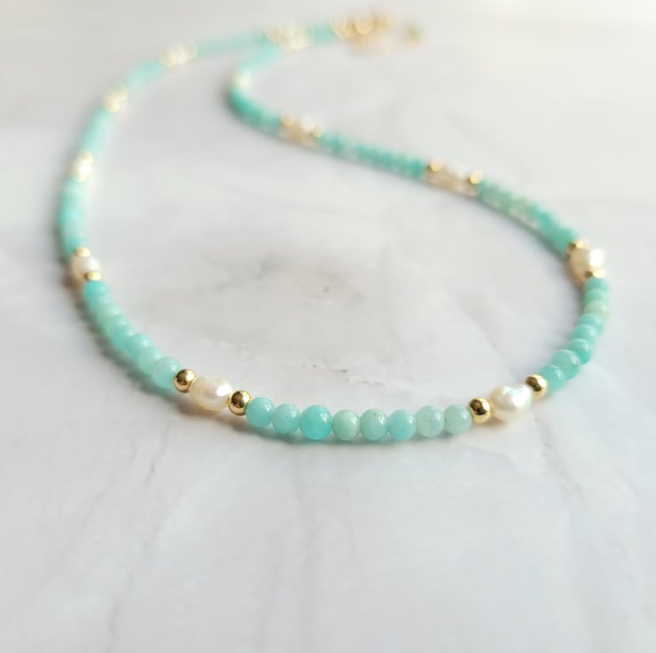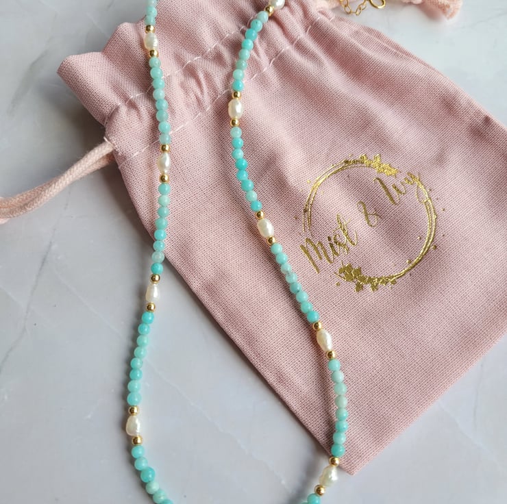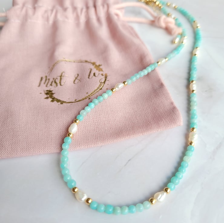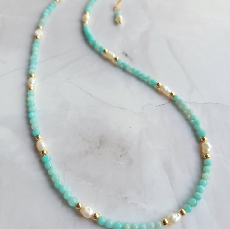 This beautiful beaded necklace is made with amazonite gemstone beads, freshwater pearls and gold filled beads. The necklace is finished with a spring ring clasp and extension chain allowing a length of around 40-45cm.