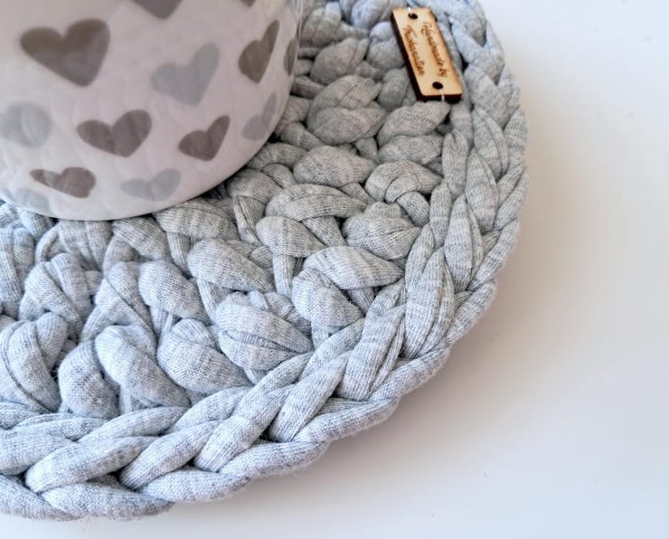 Handmade using a crochet technique with recycled t-shirt yarn, these are sold as advertised, or made to order in the colour of your choice.
