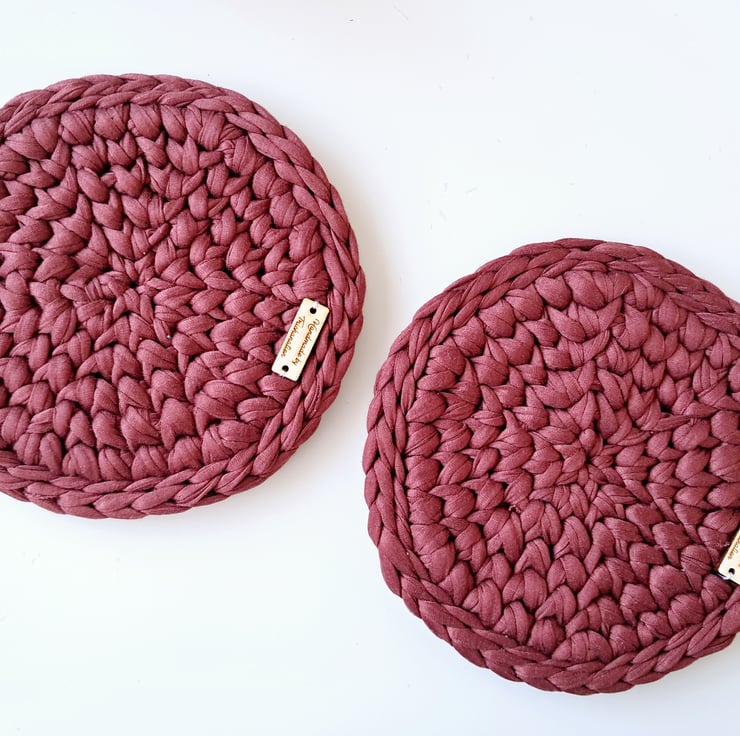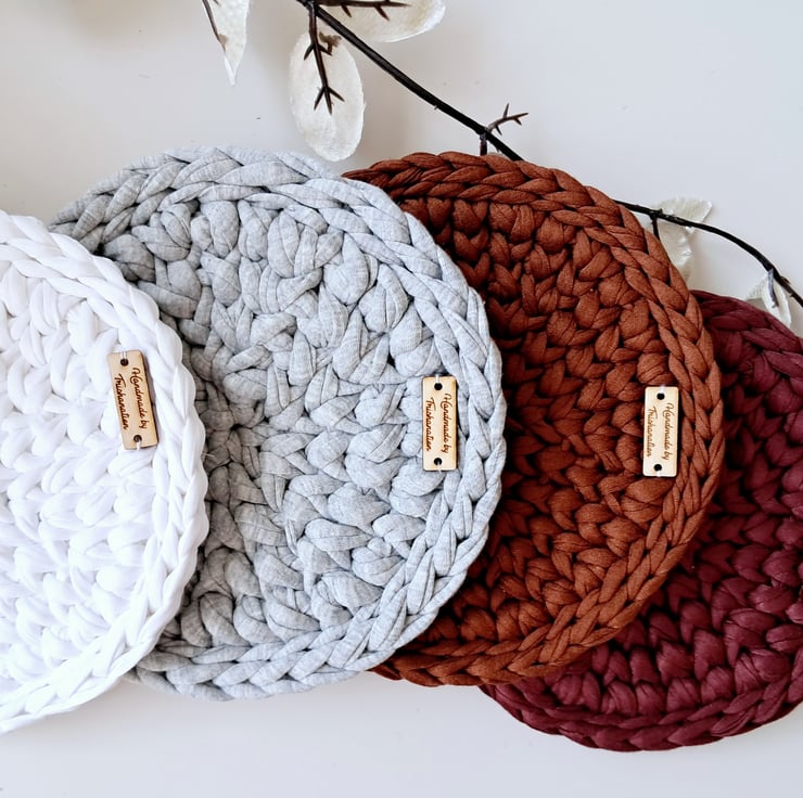 Handmade using a crochet technique with recycled t-shirt yarn, these are sold as advertised, or made to order in the colour of your choice.