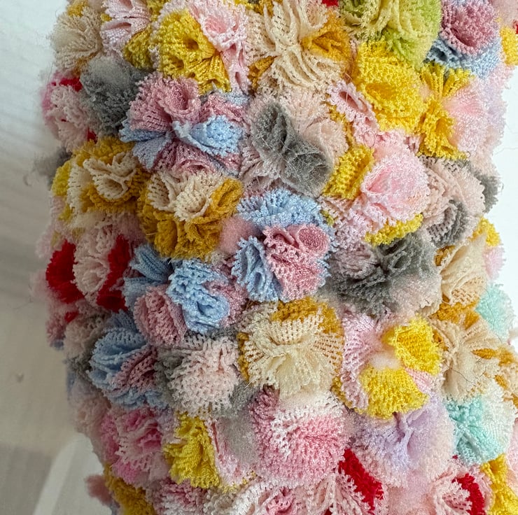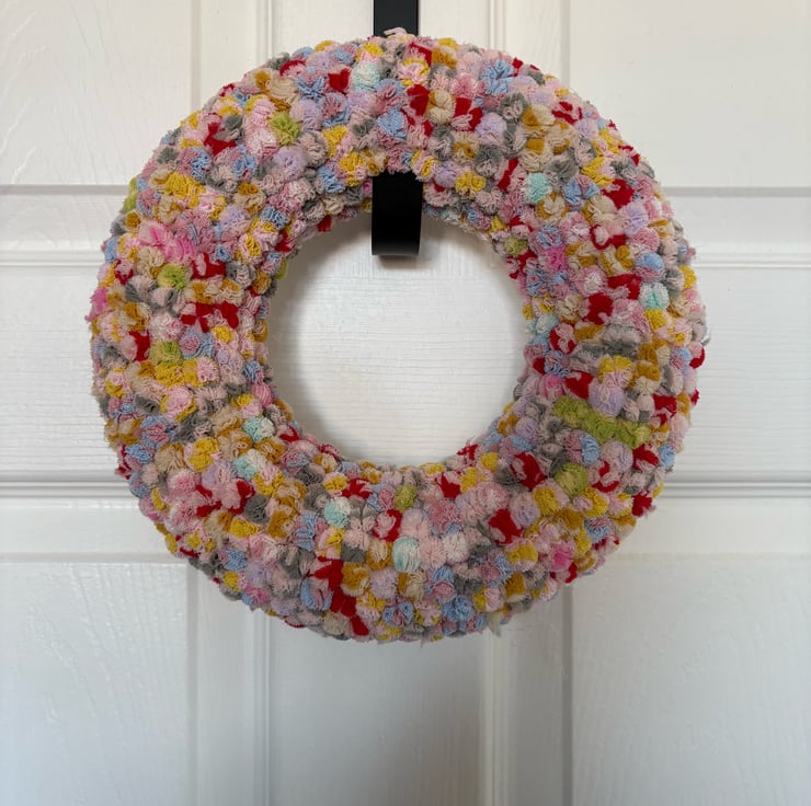 Beautiful baby shower wreath. Using tiny multi coloured scrunchy Pom Poms.