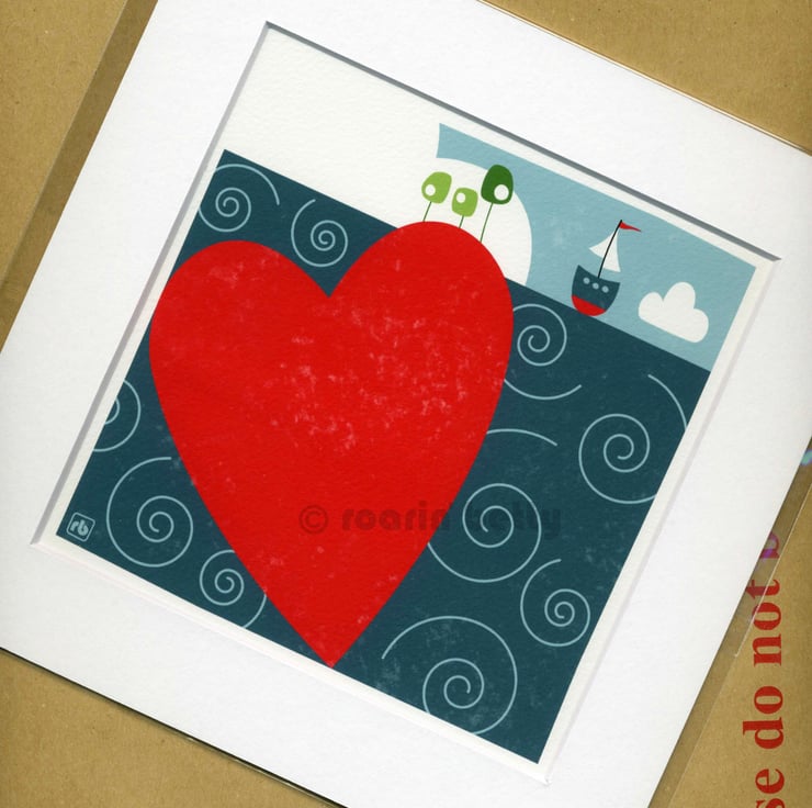 This print is inspired by my sailing adventures and love of the sea. I remember the joy of seeing land after a long time at sea and I love the idea of the island just being the very tip of a huge heart- representing a love as big as the ocean.