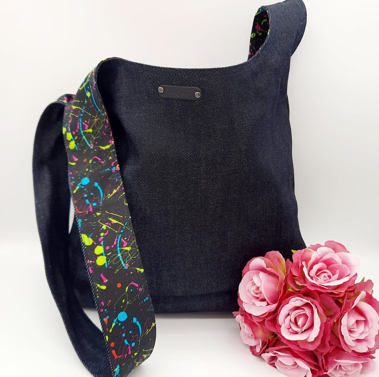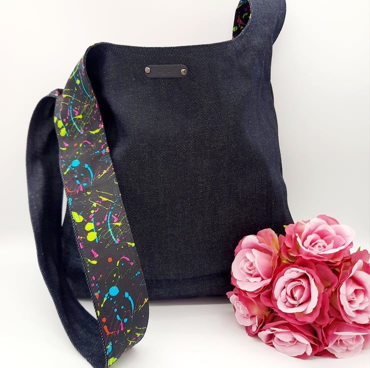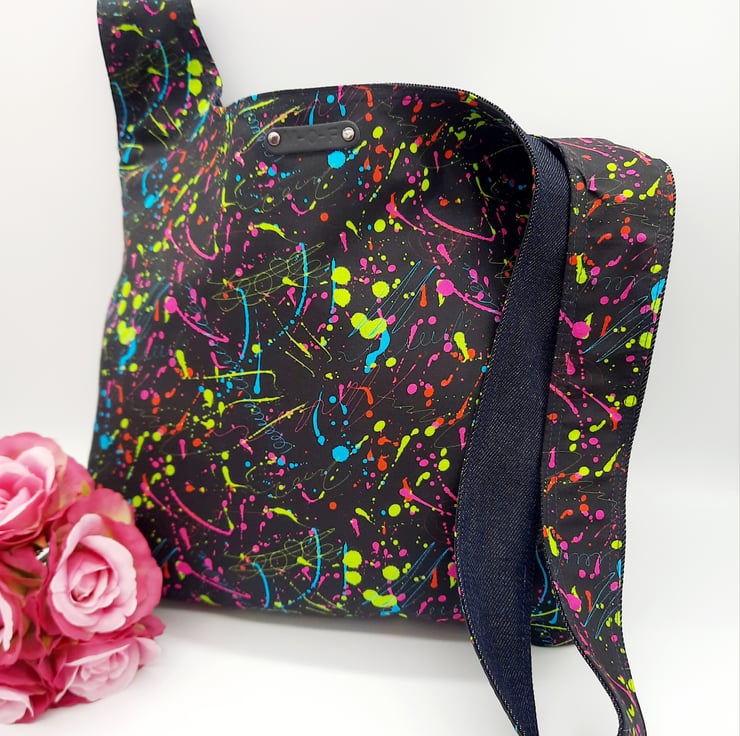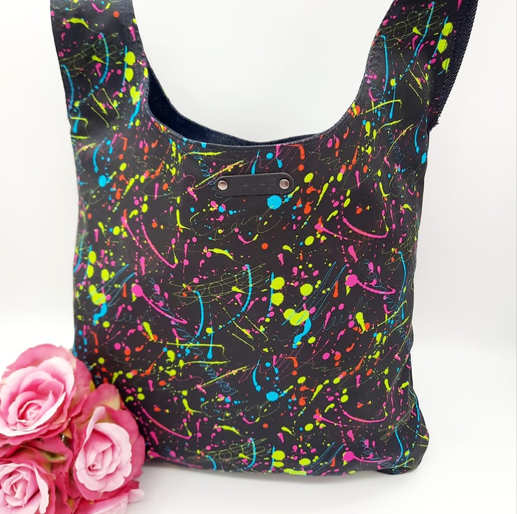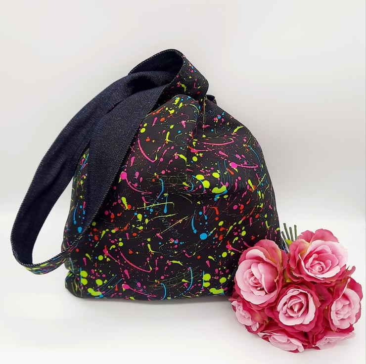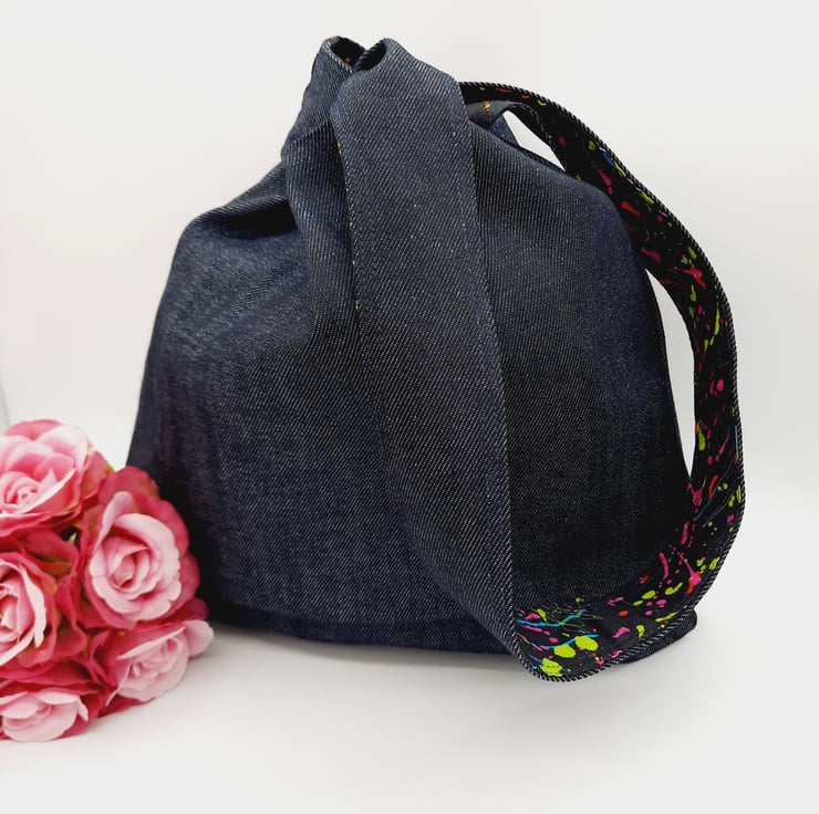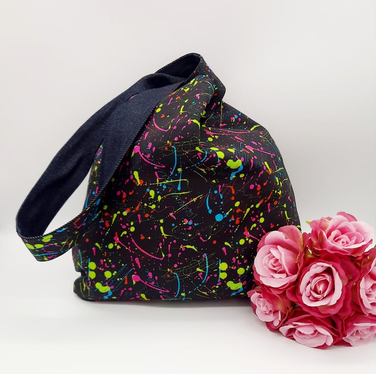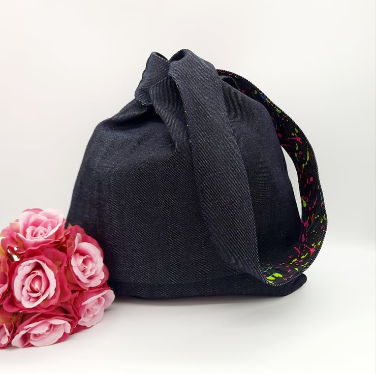 This funky reversible knot bag is a dark navy denim on one side and a black neon splash cotton on the other.