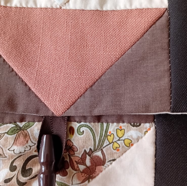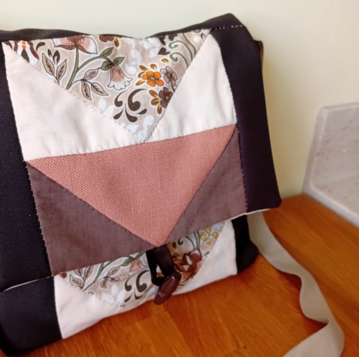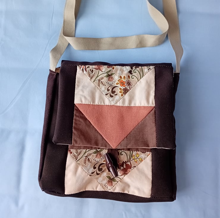 Lovely gift, or useful accessory for yourself. Handsewn patchwork shoulder bag, made from a plain mocha coloured cotton, a plain cream cotton, a floral cotton and slightly heavier chocolate brown and terracotta fabrics. Lined in the cream cotton. The bag fastens with a brown toggle. It has a webbing strap in a grey/ brown.