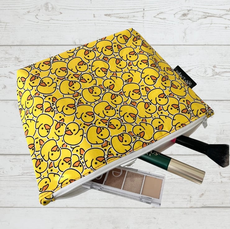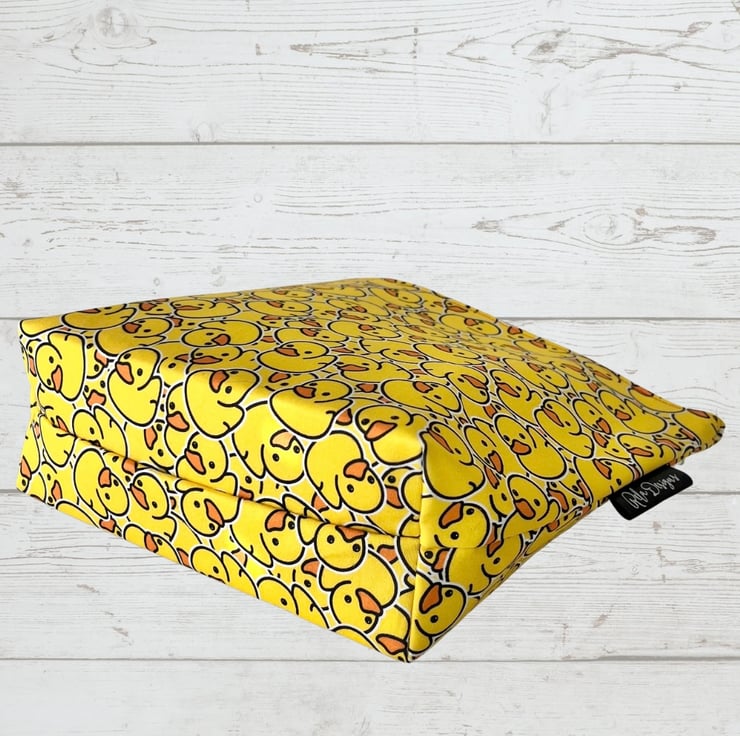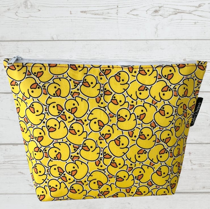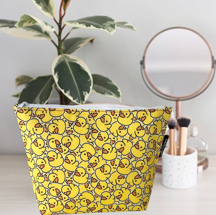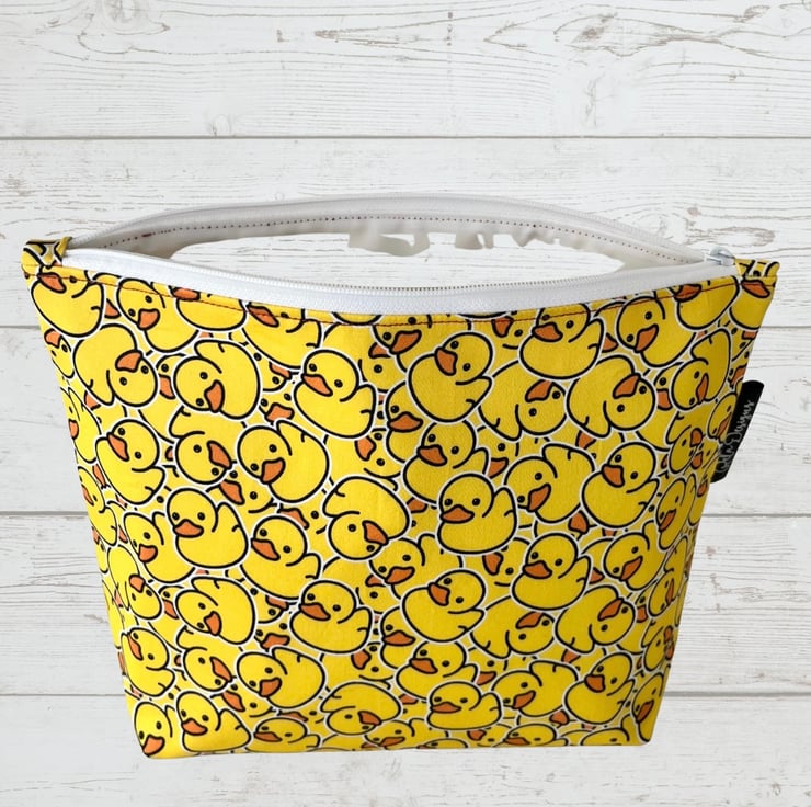This cute bath time duck print cotton zipped pouch has a white waterproof nylon lining , great for those inevitable spills.
