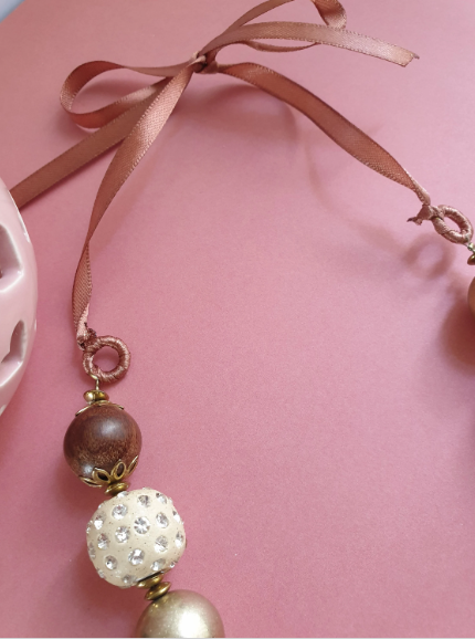 Bold and beautiful! This gorgeous necklace in shades of brown, peach, white and gold is 90 cm long and features a selection of chunky mismatched beads finished with a ribbon for tying.