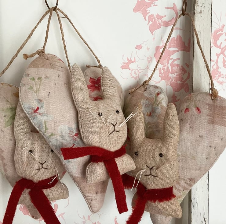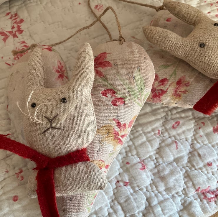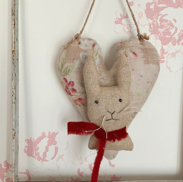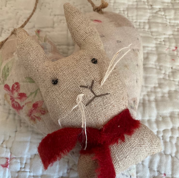 Attached to the front of the quilt heart is a cute bunny, wearing a wool scarf, for those Spring days that still have a chill in the air. The eyes are beaded, and the nose is hand stitched. The whiskers are created from jute twine.