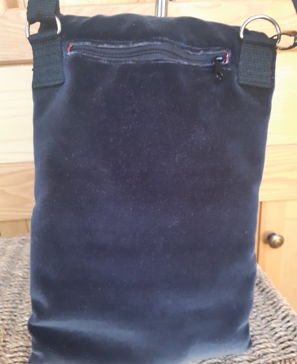 Slim crossbody bag in dark blue velvet with zipped pocket on the back. Two compartments lined in a red cotton print, magnetic fastener on front flap, and adjustable cotton webbing strap.
