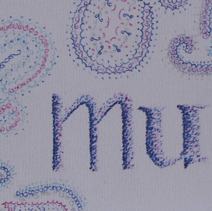'Mum' is worked in pontillism (dots), surrounded by handdrawn paisley pattern motifs in pastel colours. Plain white insert inside card for your own message.