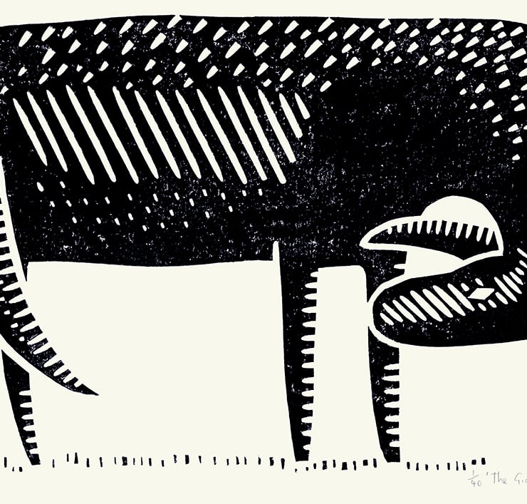 This is a hand-pulled A3 size linocut / screen-print entitled 'The Giant Donkey' printed in dark grey on off-white/cream paper.