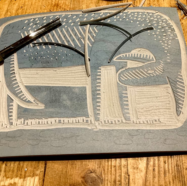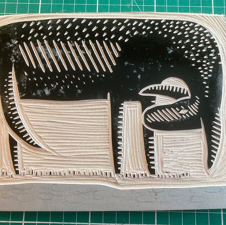 Dark grey System 3 ink on Antique White Seawhite 290gsm acid-free paper. From an edition of only 40, signed, stamped, titled and numbered. The print started out as a linocut before printing the edition as a screen-print.