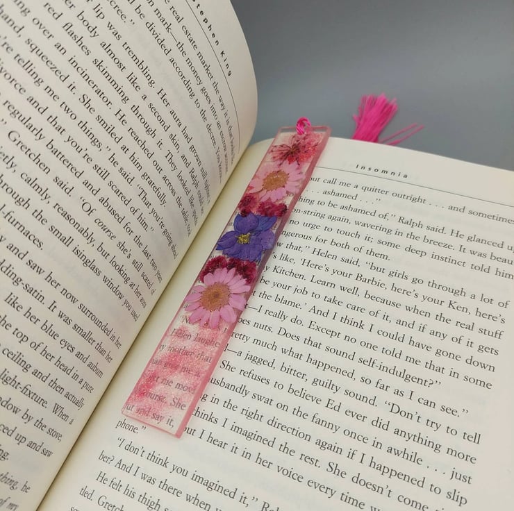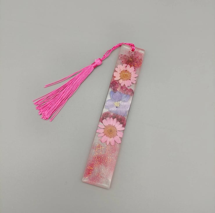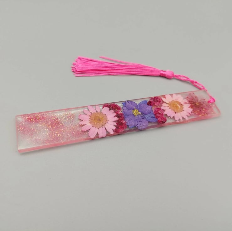 This beautiful resin bookmark has been made by using a clear resin and with beautiful dried daisies, coloured pink, and I've also used some other dyed flowers and a pink holographic glitter.