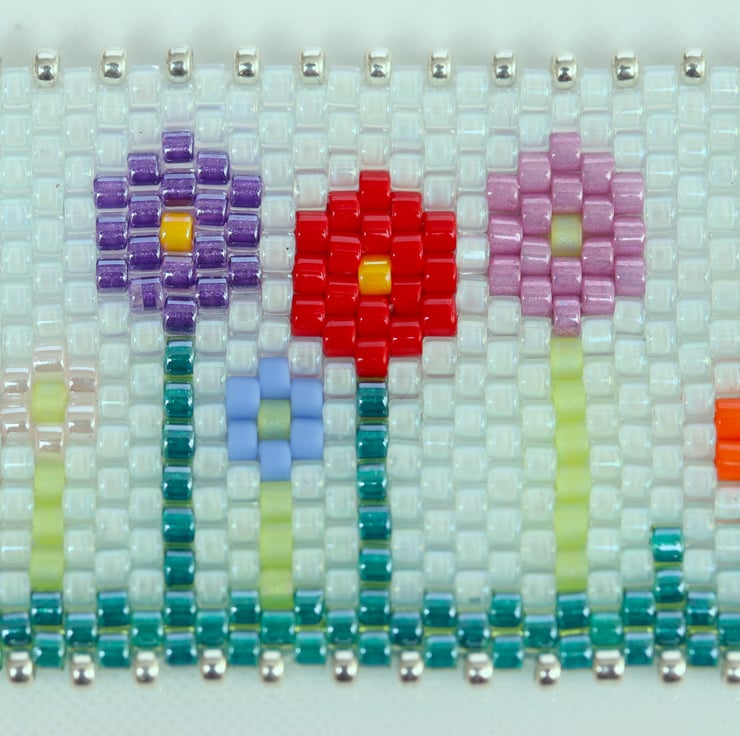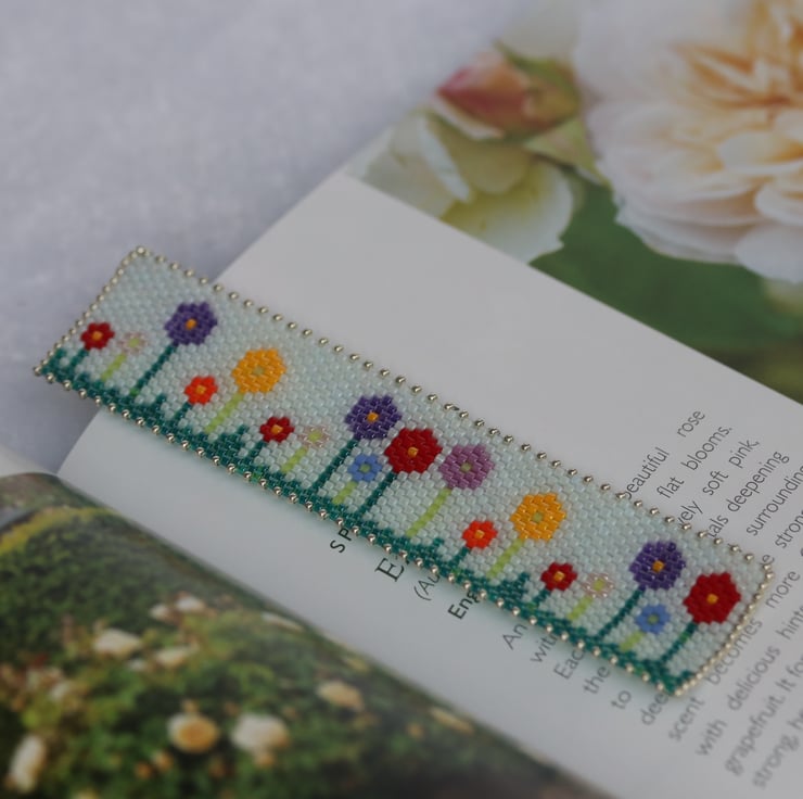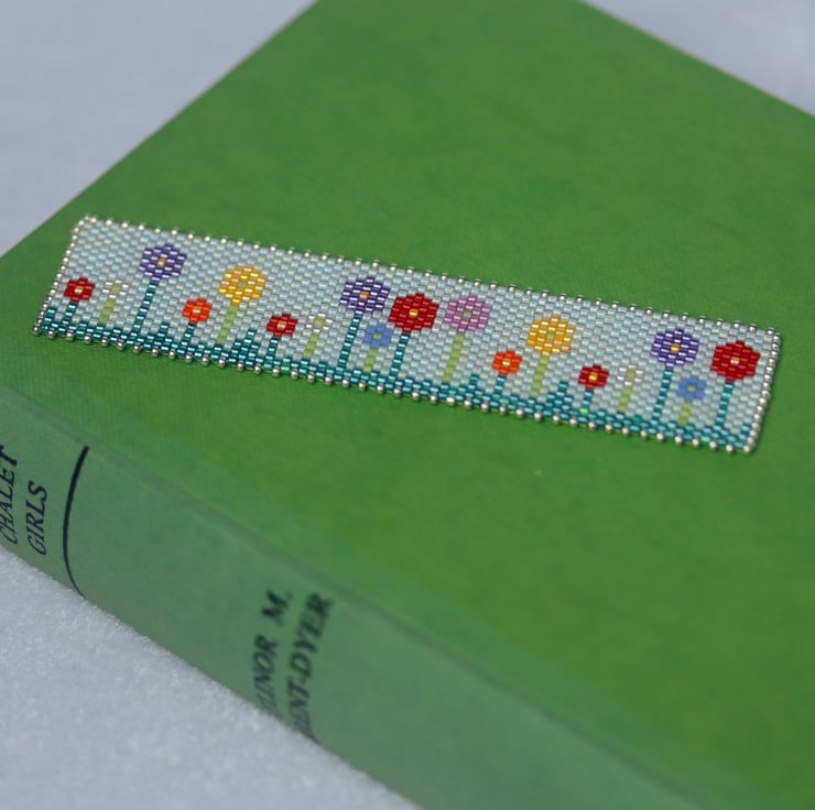 The bookmark is beadwoven, made from glass delica seed beads which have been stitched together. The pattern is double sided so that it looks the same on both sides. The design is my own: a row of multicoloured flowers growing out of the green grass, against a sky blue background. The book mark is finished with a tiny border of shiny silver beads.