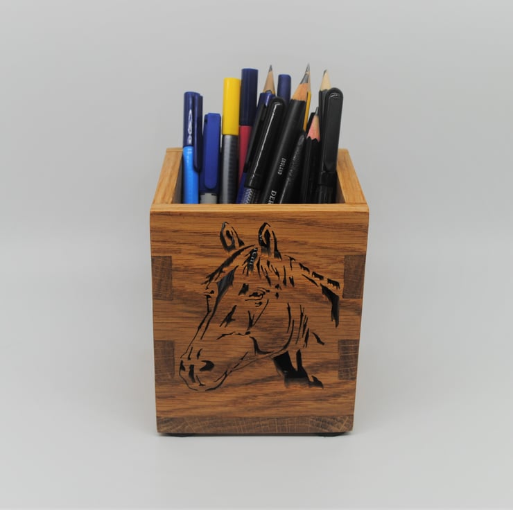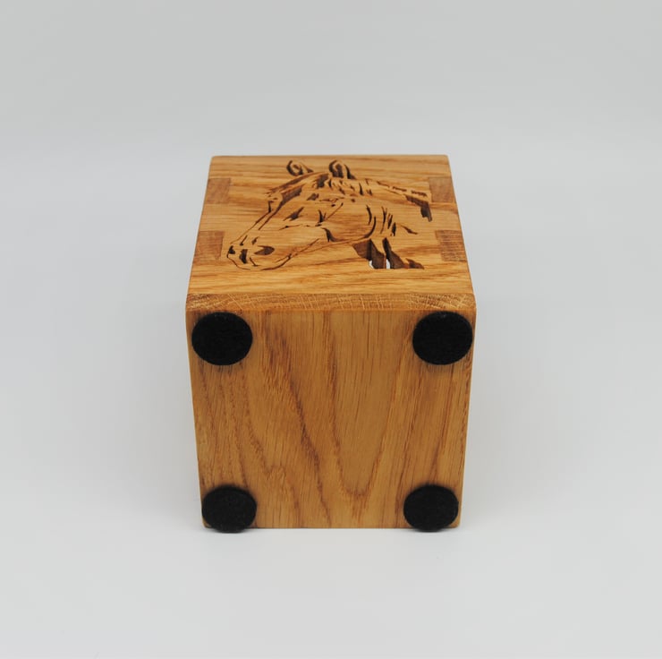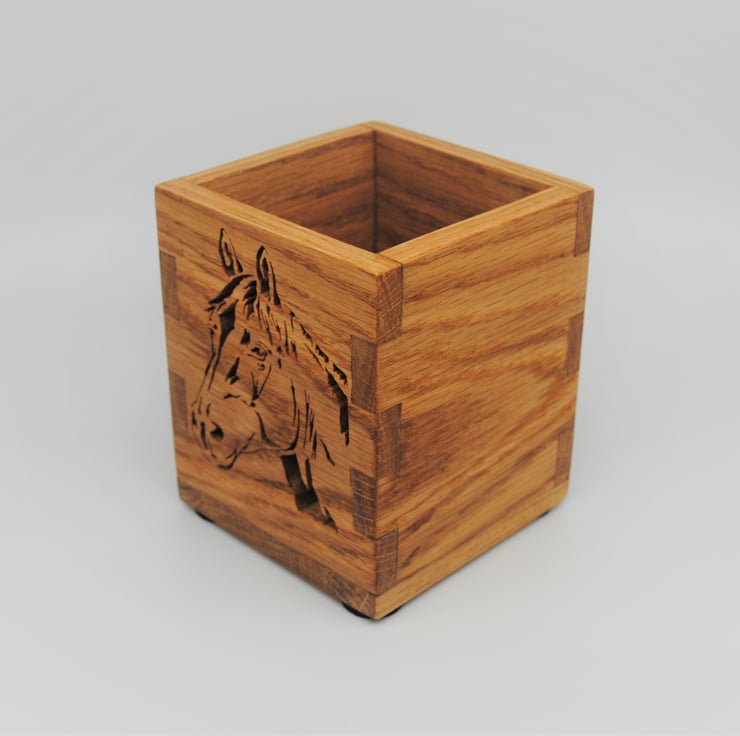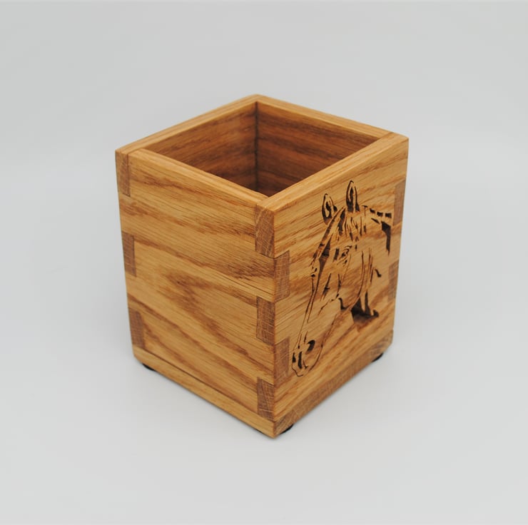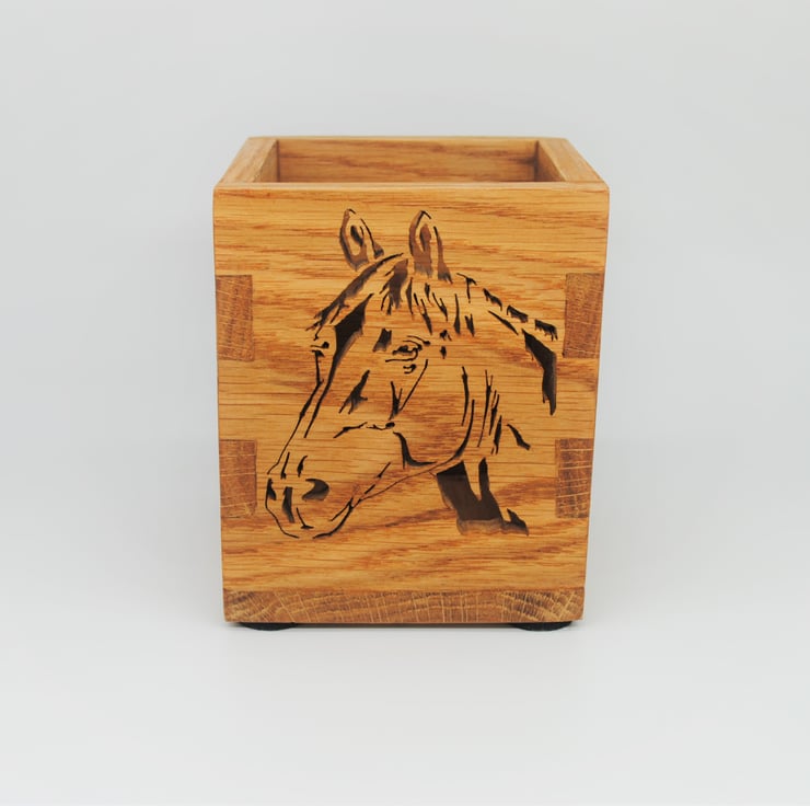 A perfect desk tidy or decorative storage box. Made from Oak wood and finished with Danish Oil to bring out the natural grain and colour of the wood. The box and Horse image have been cut with a scroll saw.