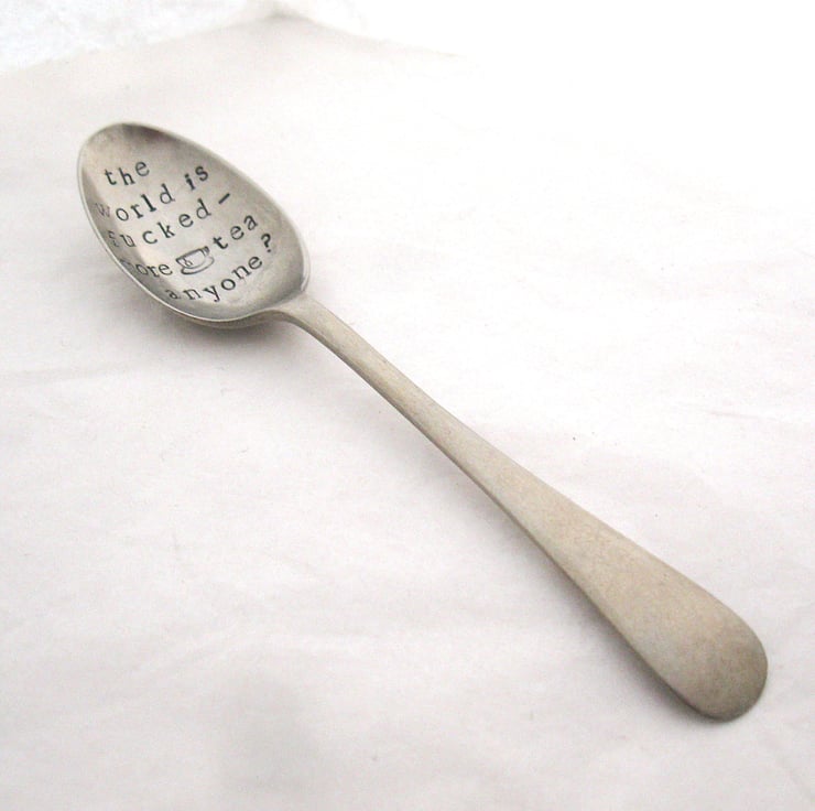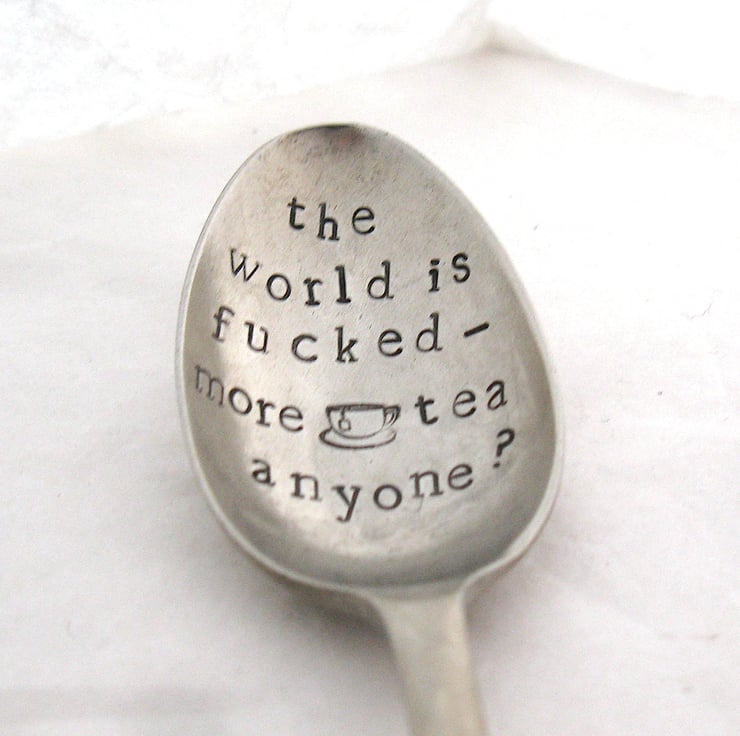 A very British stiff-upper-lip response to all the awful things going on in the world right now: offer a cup of tea! I've hand stamped a little teacup picture and the words 'the world is f-cked - more tea anyone?' onto a vintage nickel silver alloy teaspoon. It made me laugh anyway, which was the point. Humour is very good as a coping mechanism. I hope it works for you too.