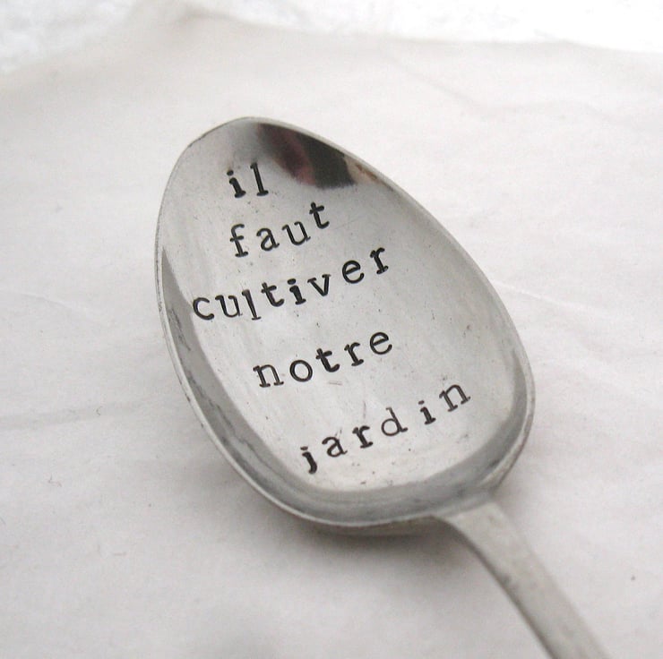 A hand stamped vintage nickel silver alloy tea spoon with a quote from the end of Voltaire's 'Candide':