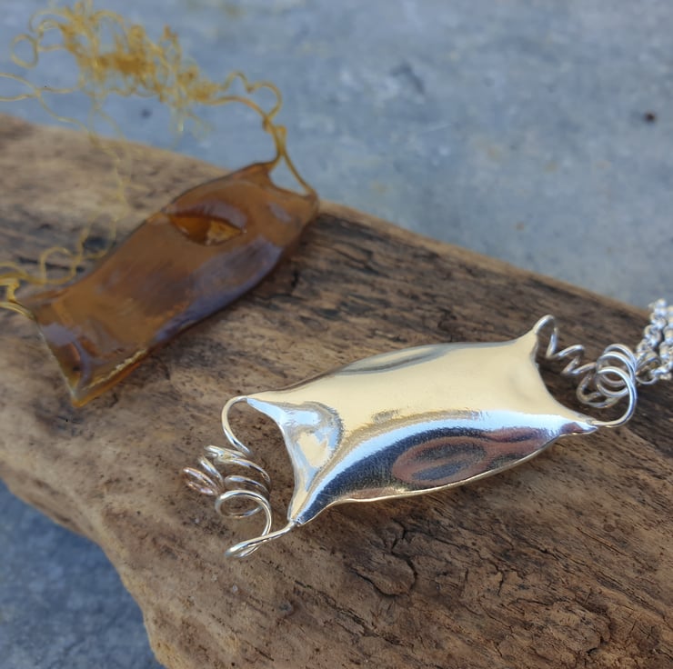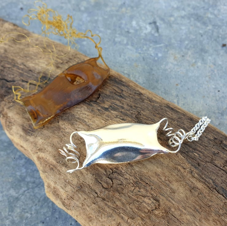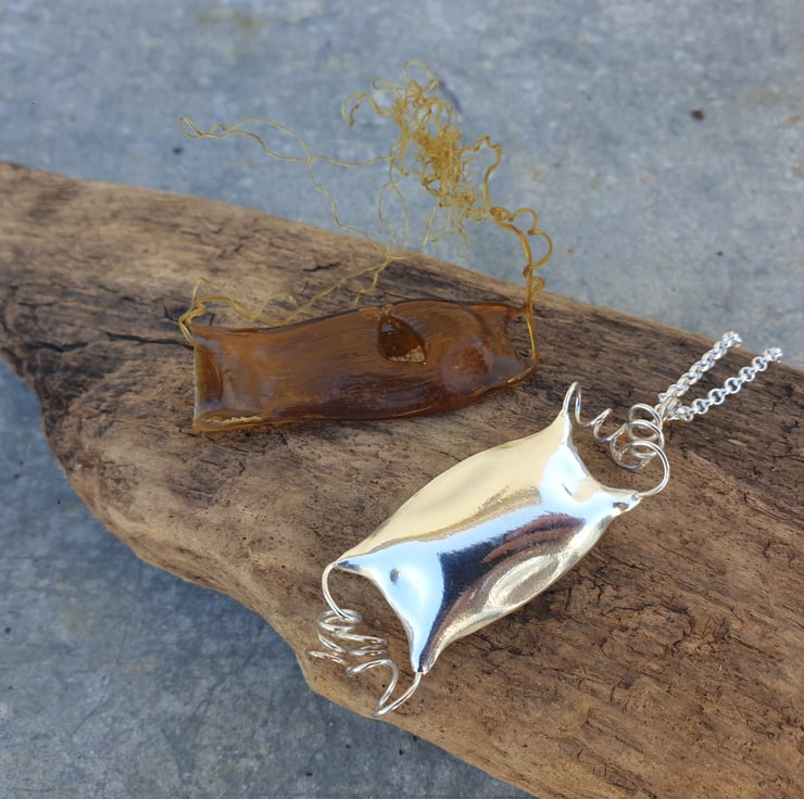 Mermaid's purses are one of my favourite things to find when beachcombing, especially those with tiny tendrils that attach to seaweed. This pendant is made from 0.5mm fine silver which has been given a light texture. Sterling silver tendrils have been added and formed into a loop for the chain. The mermaid's purse is hollow like the real thing and as such is lightweight and easy to wear. Measuring approx 6cm from top to bottom of the tendrils and 2cm across, the pendant comes with a 16 or 18 inch sterling silver belcher chain. If you would prefer a longer chain, please get in touch before purchase.