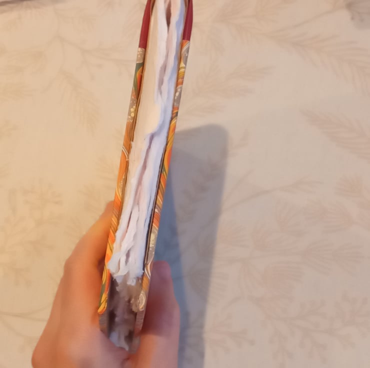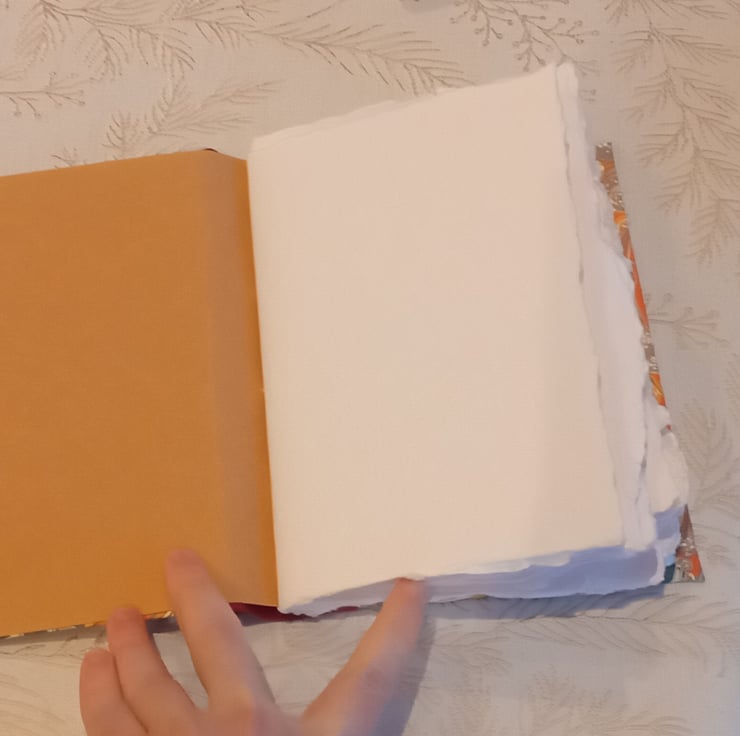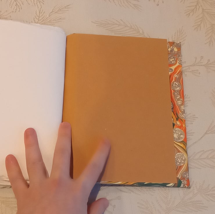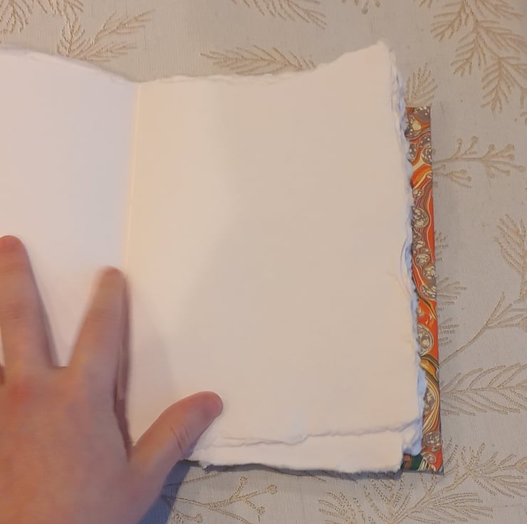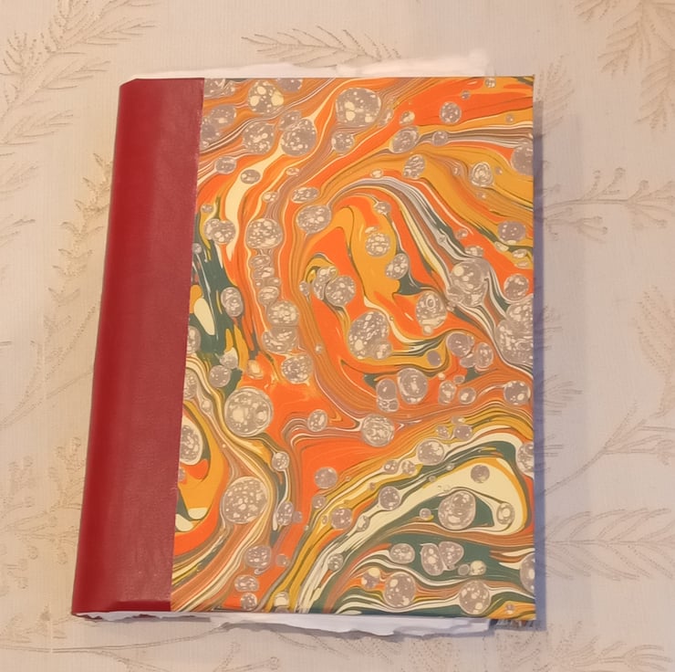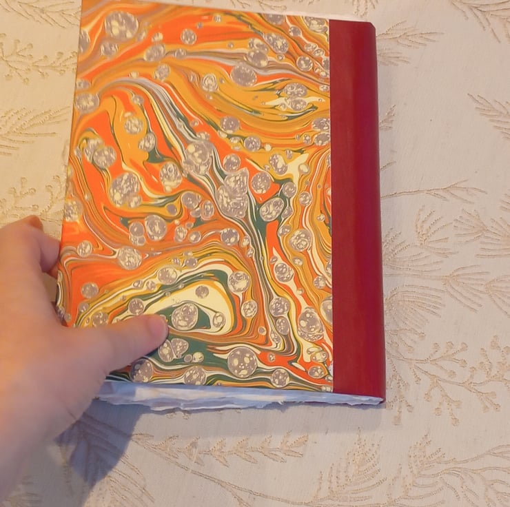 Hand made from scratch, single 20 leave / 40 side signature of hand-torn indian cotton rag watercolour paper with a mid-rough surface texture and nice thick weight (approx 250 gsm) sewn with linen thread, covered with printed marbled design hardcover with a bonded leather spine.