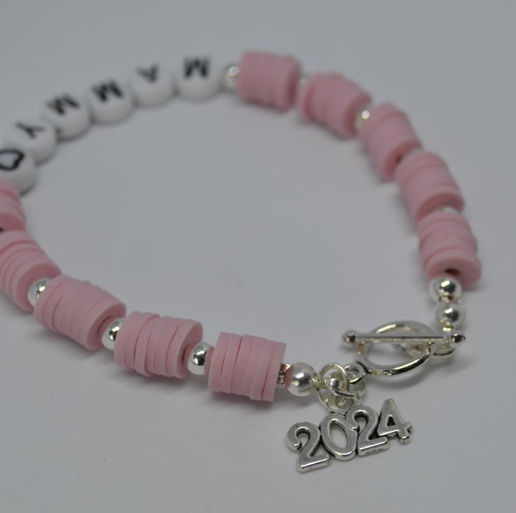 A lovely little lightweight bracelet made using clay heshi beads, acrylic letters spelling out "Mammy" and plastic silver spacer beads. It is finished off with a silver plated toggle clasp and a silver plated charm with the year 2024. This bracelet is ideal for someone who became a Mammy in 2024 and who'll be celebrating their first Mothers Day in 2025. It is approx. 6 inches in length and will come in a little organza bag.