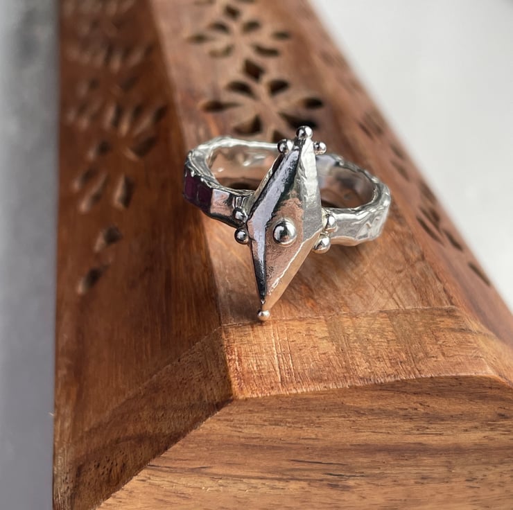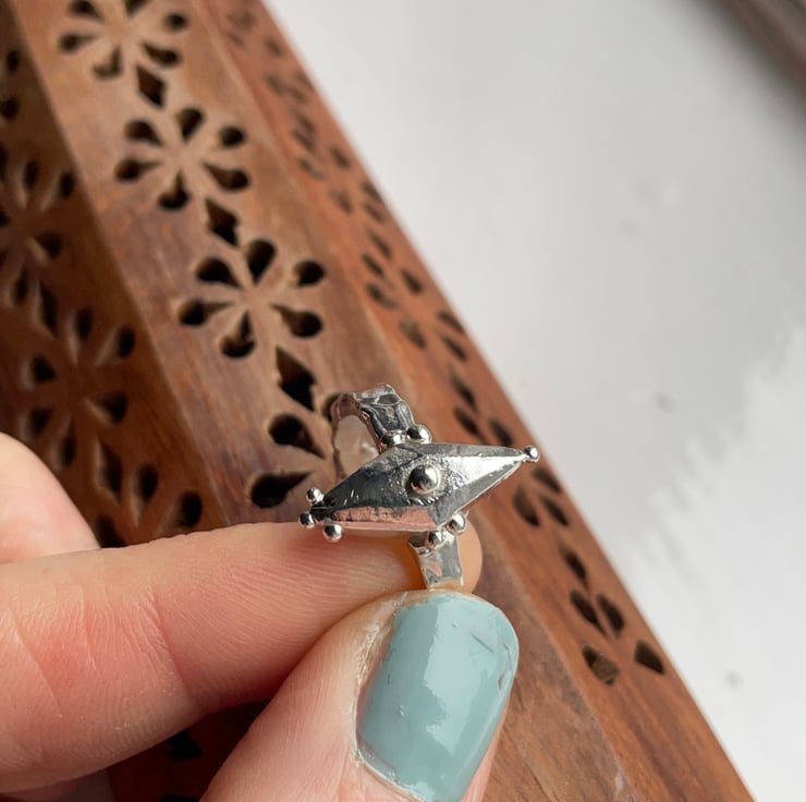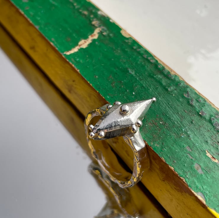 This ring was inspired by the shape and design of Viking shields. It was completely made in wax before being cast in sterling silver. The band contrasts with the smooth centre piece due to its molten like texture.