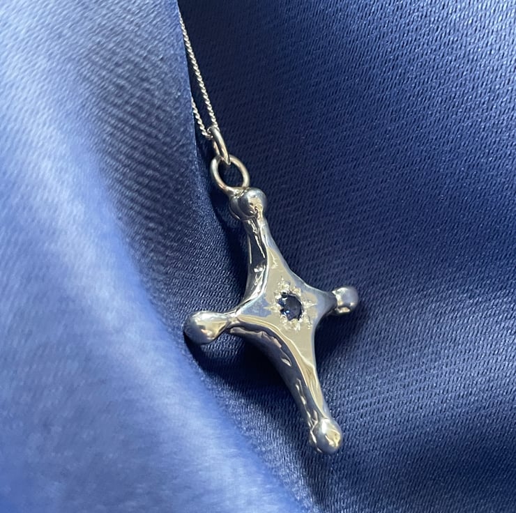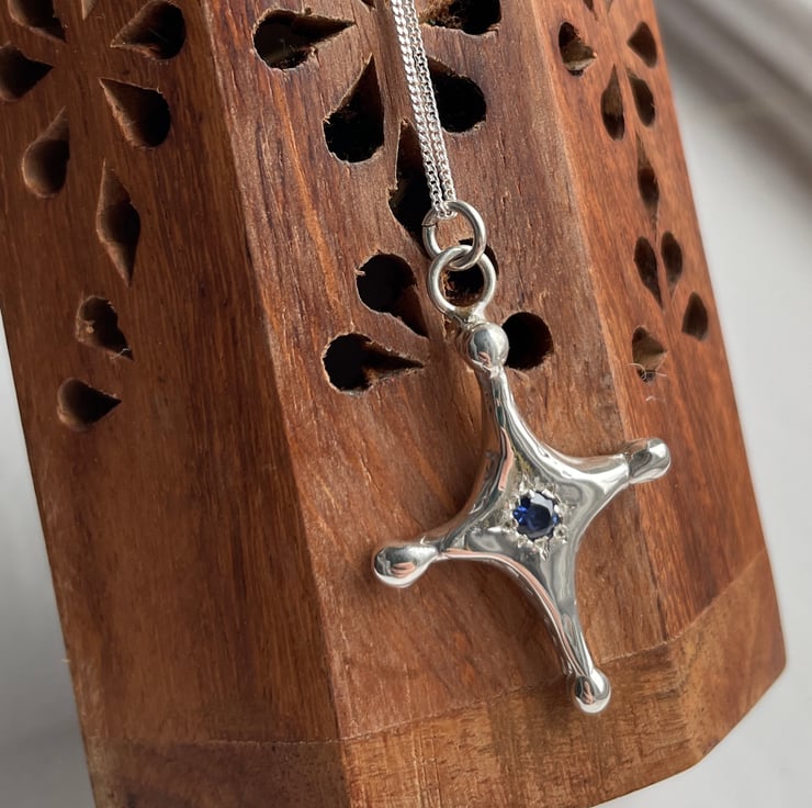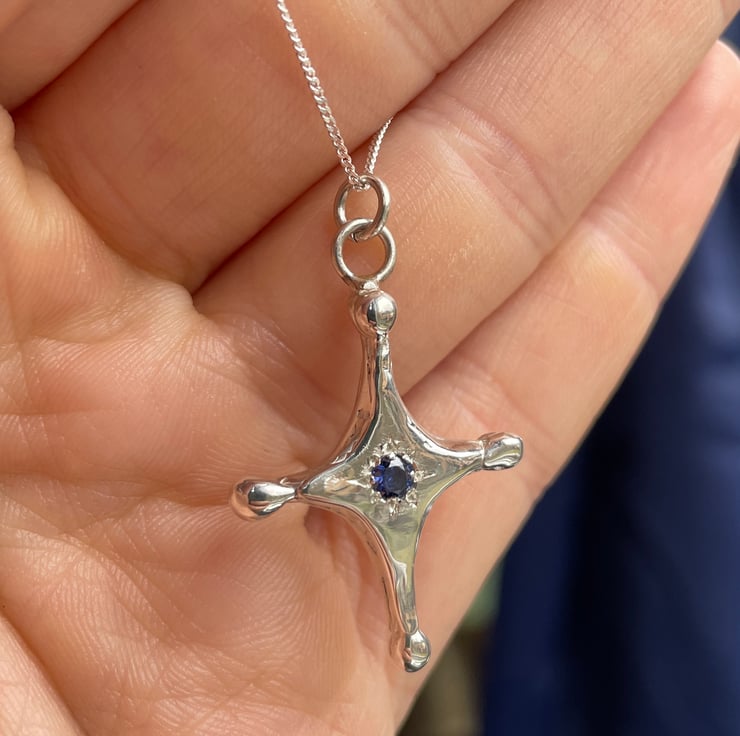 It was created in wax before being cast in recycled Sterling silver. I added in a small faceted cubic zirconia which is of a deep blue shade. It is held in place by the little “spectral lines”