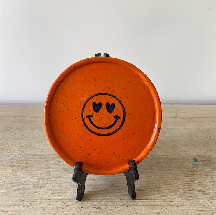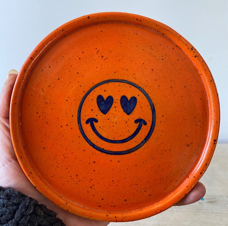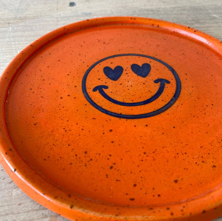Decorated with a generous wash of orange and smiley face navy blue design.