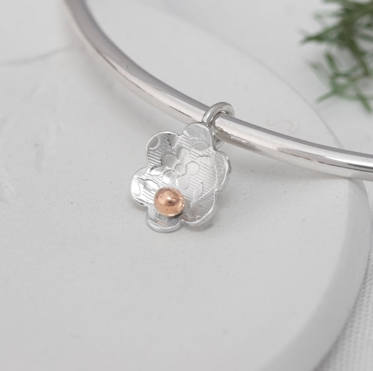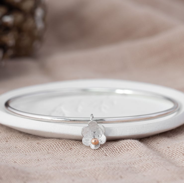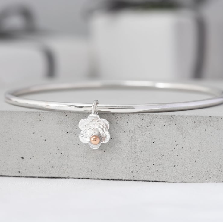 Make a wish with this rose gold flower bangle. In some cultures a silver bangle means strength while gold the symbol of fortune and prosperity. Why not have both wearing silver and gold sublimely combined in this pretty piece. One simple daisy is enough to make her wish it was hers. So why not give this beautiful bracelet for a unique anniversary gift for your wife.