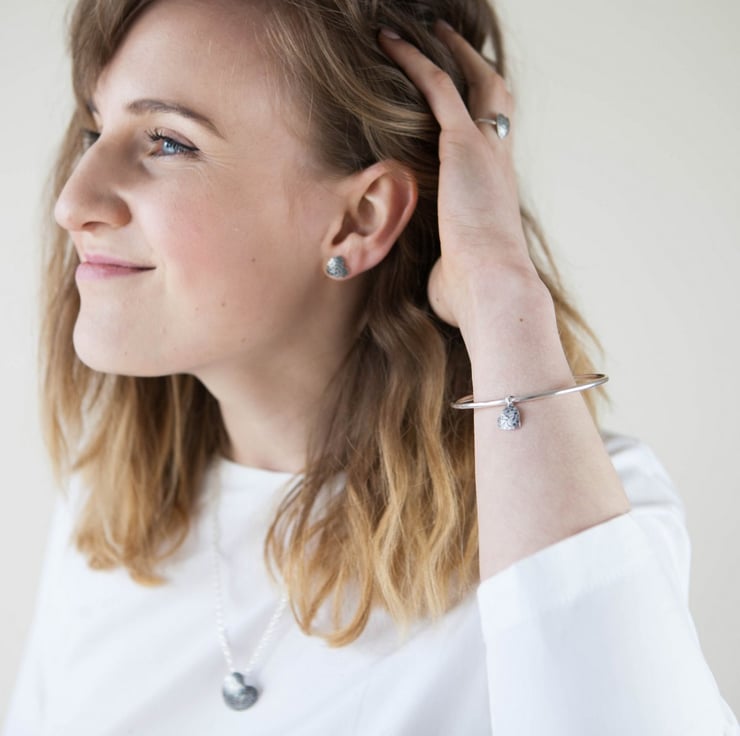 This exquisite heart charm bangle is lovingly crafted from 100% recycled sterling silver. Hanging from the bracelet is a single floral-inspired heart charm, which embodies a vintage aesthetic. The charm’s darker, oxidised silver finish offers a touch of elegance that transitions effortlessly from daytime wear to evening occasions.