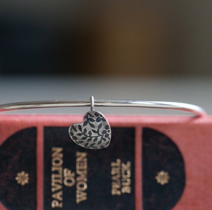 Show your love in the most enchanting way with this solid silver heart charm bangle from my Vintage Floral collection. Whether you're marking a special occasion or simply treating your fiancé, this charm bracelet is the perfect token of affection. Designed to captivate, it can be worn solo for a classic look or layered with other stacking bangles for added charm. The timeless pairing of hearts and floral motifs conveys a heartfelt message of love, making it a wonderful eco-friendly birthday gift for someone truly special.