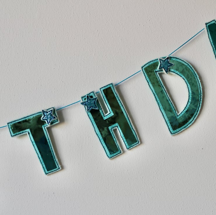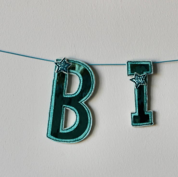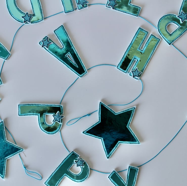 Each of the thirteen letters and two stars suspended along this garland, is sewn using a combination of 100% wool felt, cotton cloth, shining fabric and free hand machine embroidery; multiple layers of cloth are sewn together and cut out by hand using very sharp scissors. Each letter has a sewn glitter fabric star.