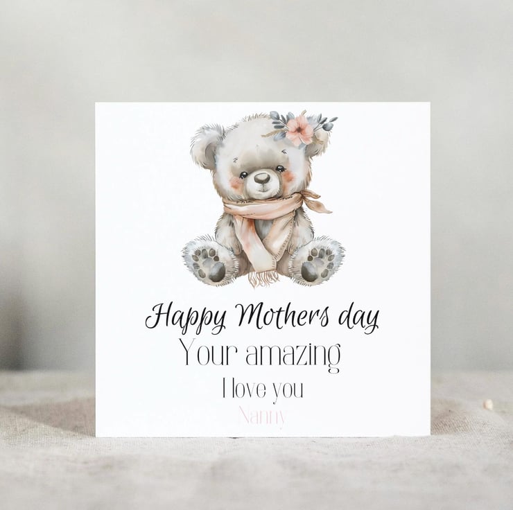 A Mother’s Day card for a Nanny featuring a cute teddy bear with a pink scarf