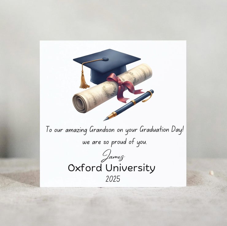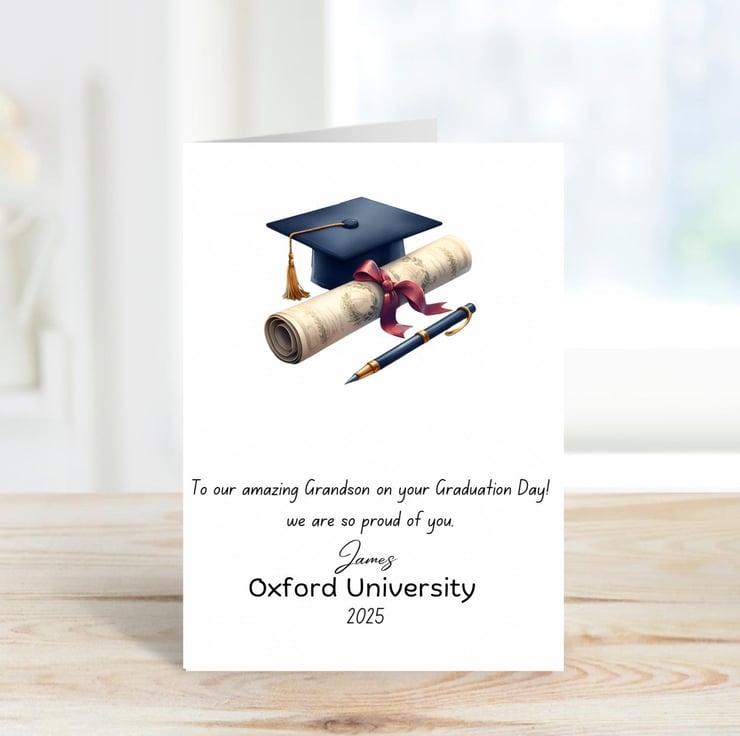 Send congratulations with this lovely Personalised Gradation card featuring a mortar hat and scroll tied with ribbon, On a white background,